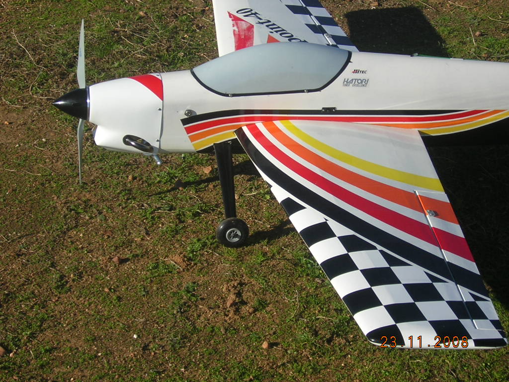 Tiene un Yamada .63 con una helice 12x7 Sonic, pesa 2.500 gr. Al fuseleja le he quitado el monokote y lo he reforzado con una cinta de carbono en la zona del tren y bajo las alas, acabado con fibra y pintado, esto a supuesto unos 90 gramos más.
