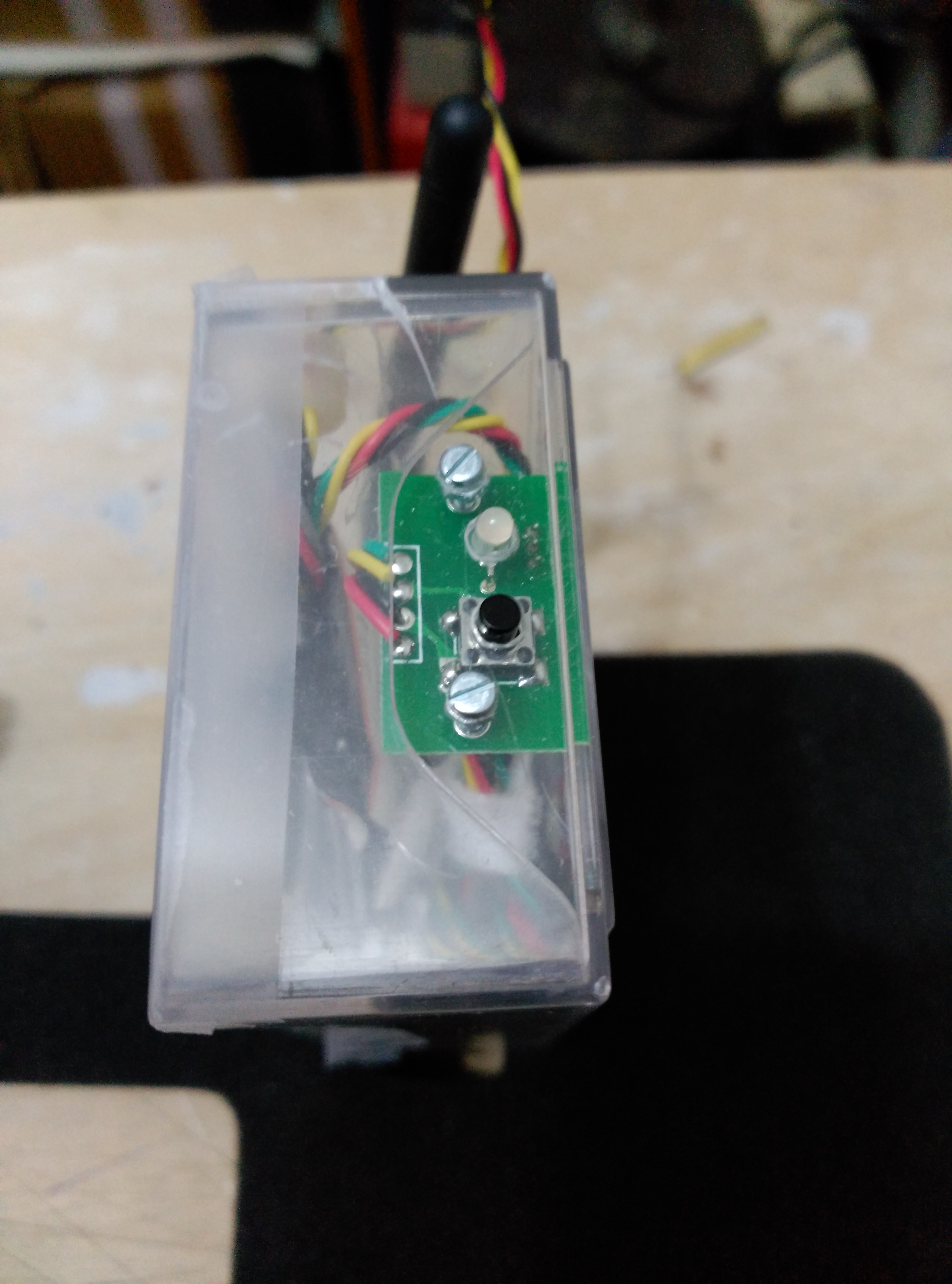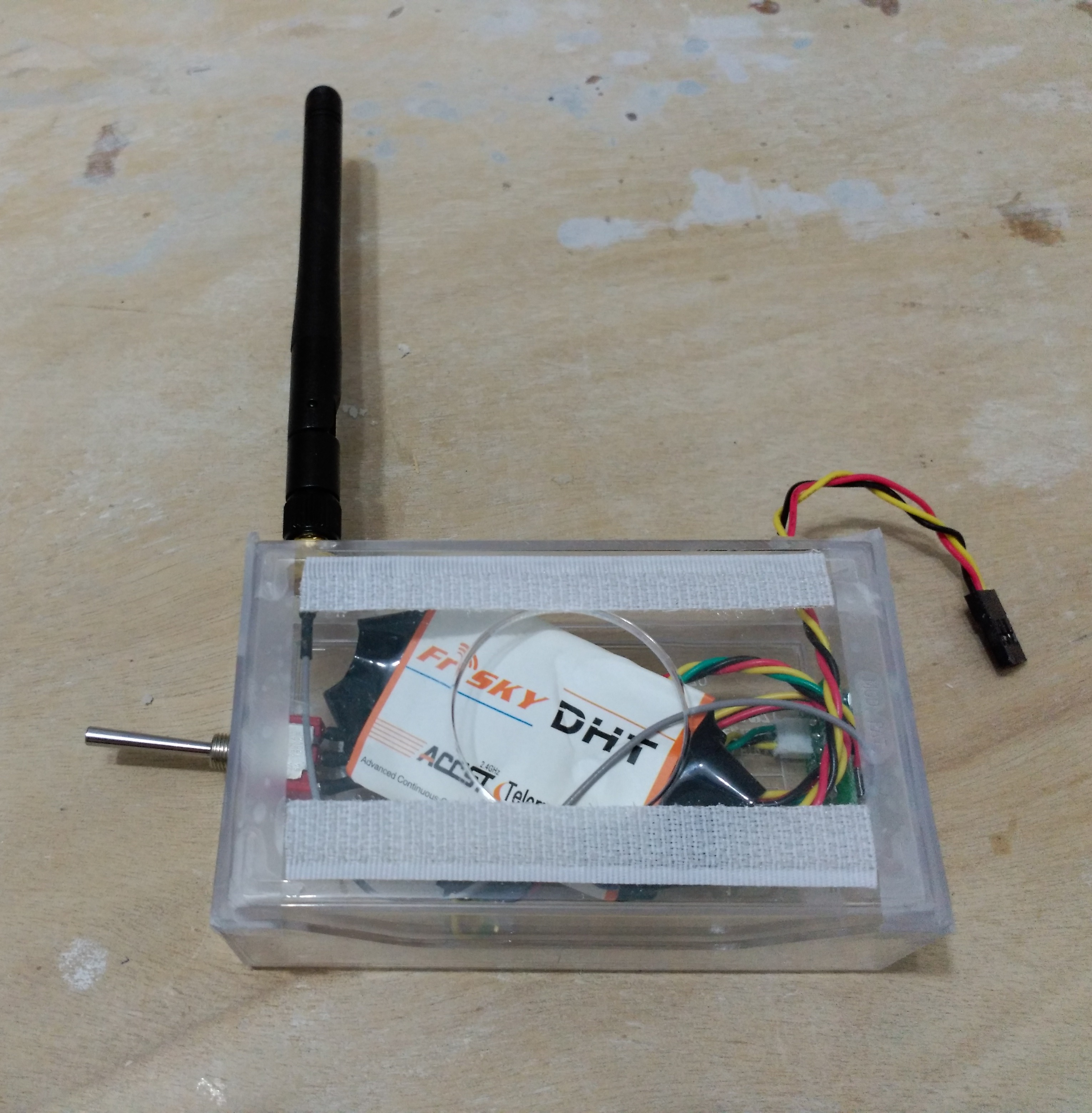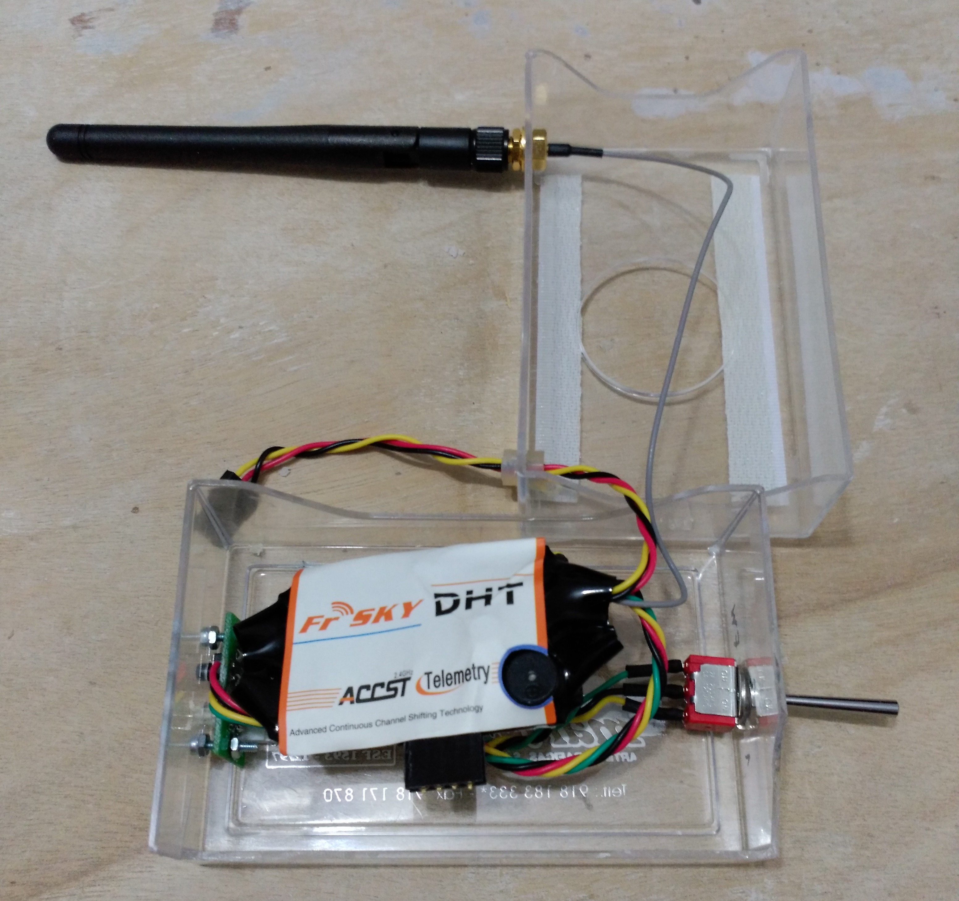 Nosotros hemos optado por la vía rápida de meterlo en una caja de tarjetas de visitas, de esta forma no rompemos la estética de la emisora con los agujeros necesarios para sacar el conmutador para la selección del tipo de receptor, el pulsador de enlace, la antena; y hacer la soldadura en la placa de la emisora para la conexión del módulo mediante los cables de alimentación (negativo - positivo) y señal PPM. Realizar esta soldadura nos implicaría poner un interruptor de apagado del módulo DHT cuando trabajemos con HoTT.
