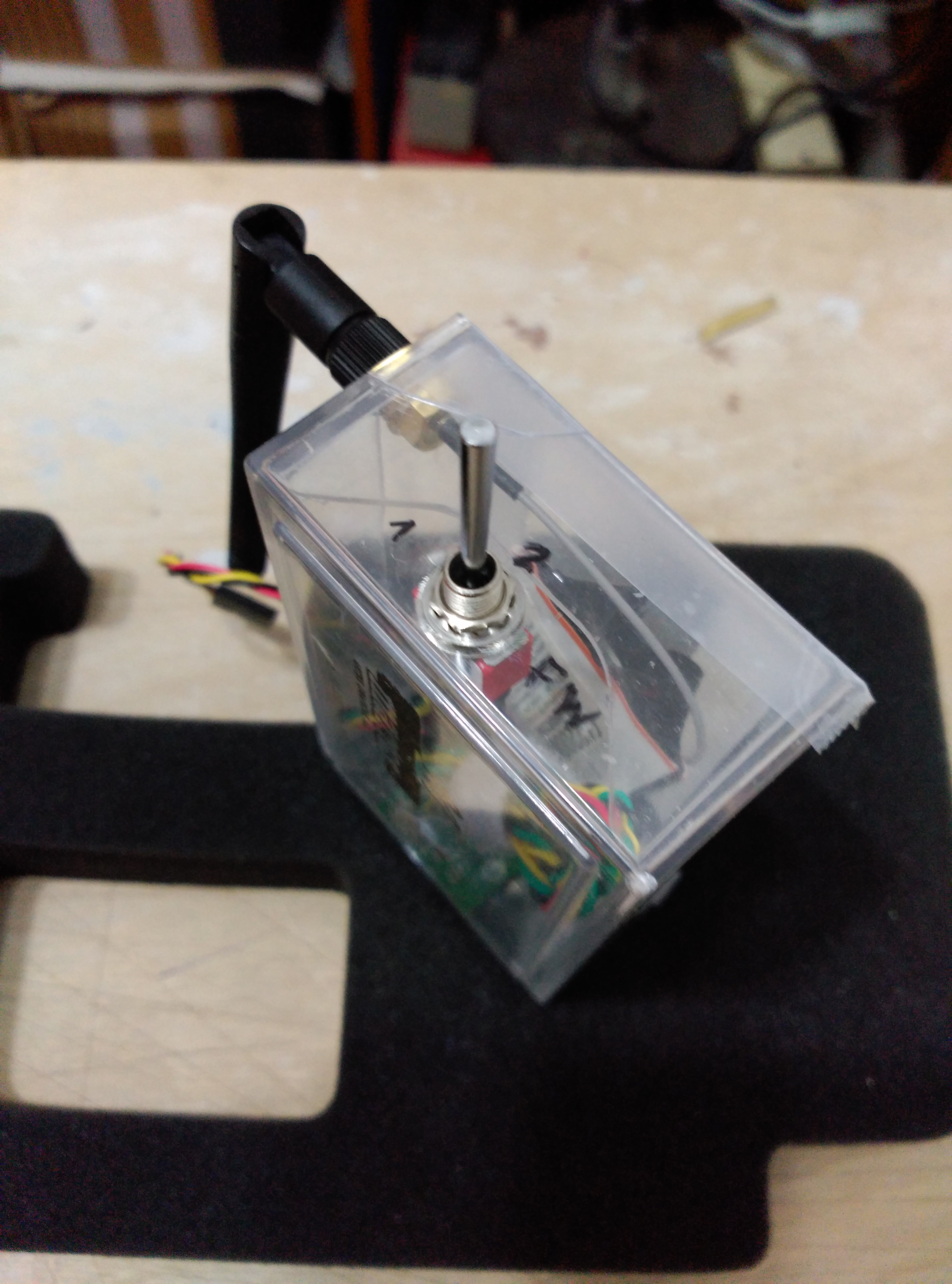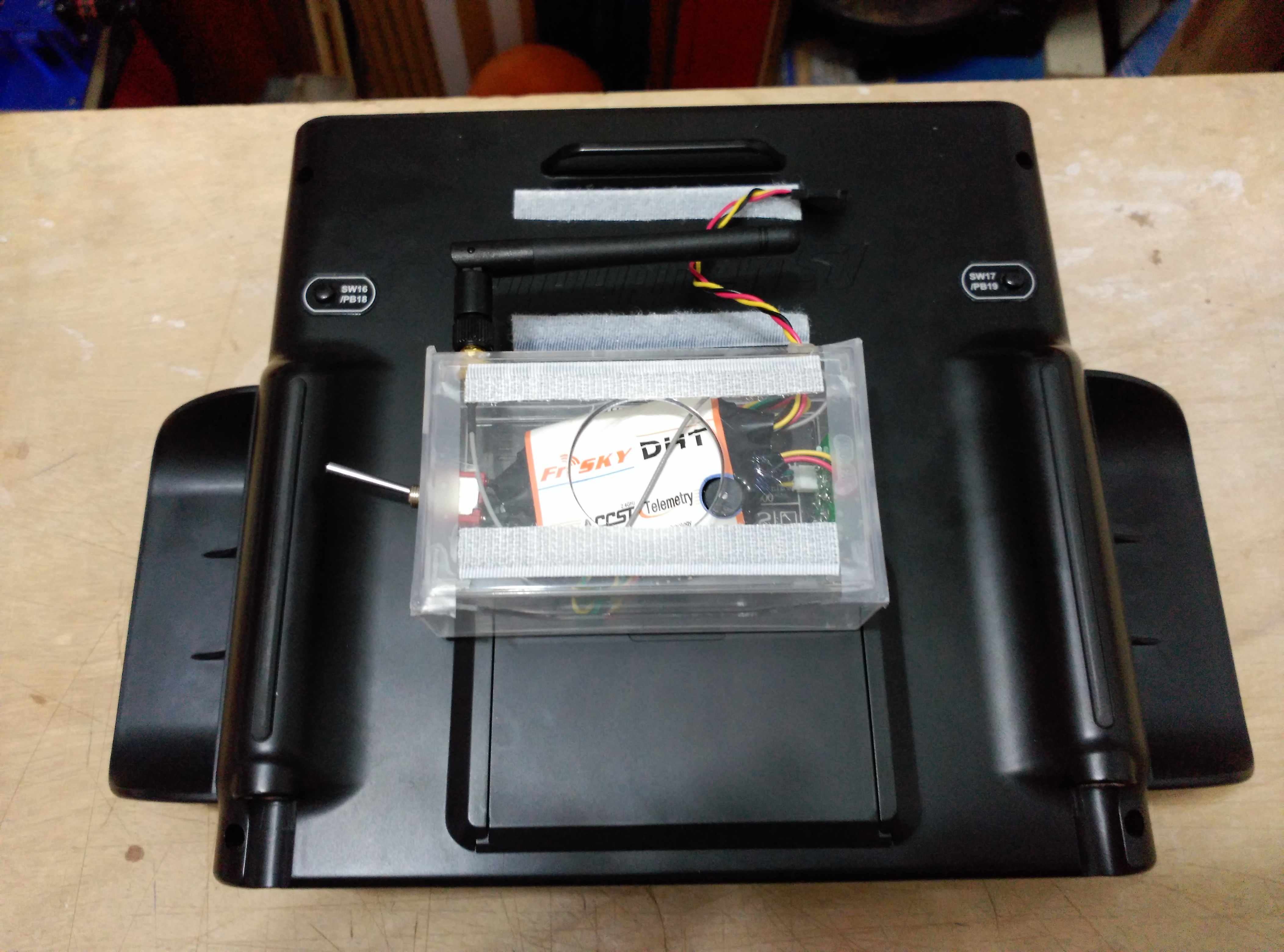Para fijar la cajita a la tapa inferior de la emisora hemos utilizado velcro, de esta forma es fácil y rápido de instalar.