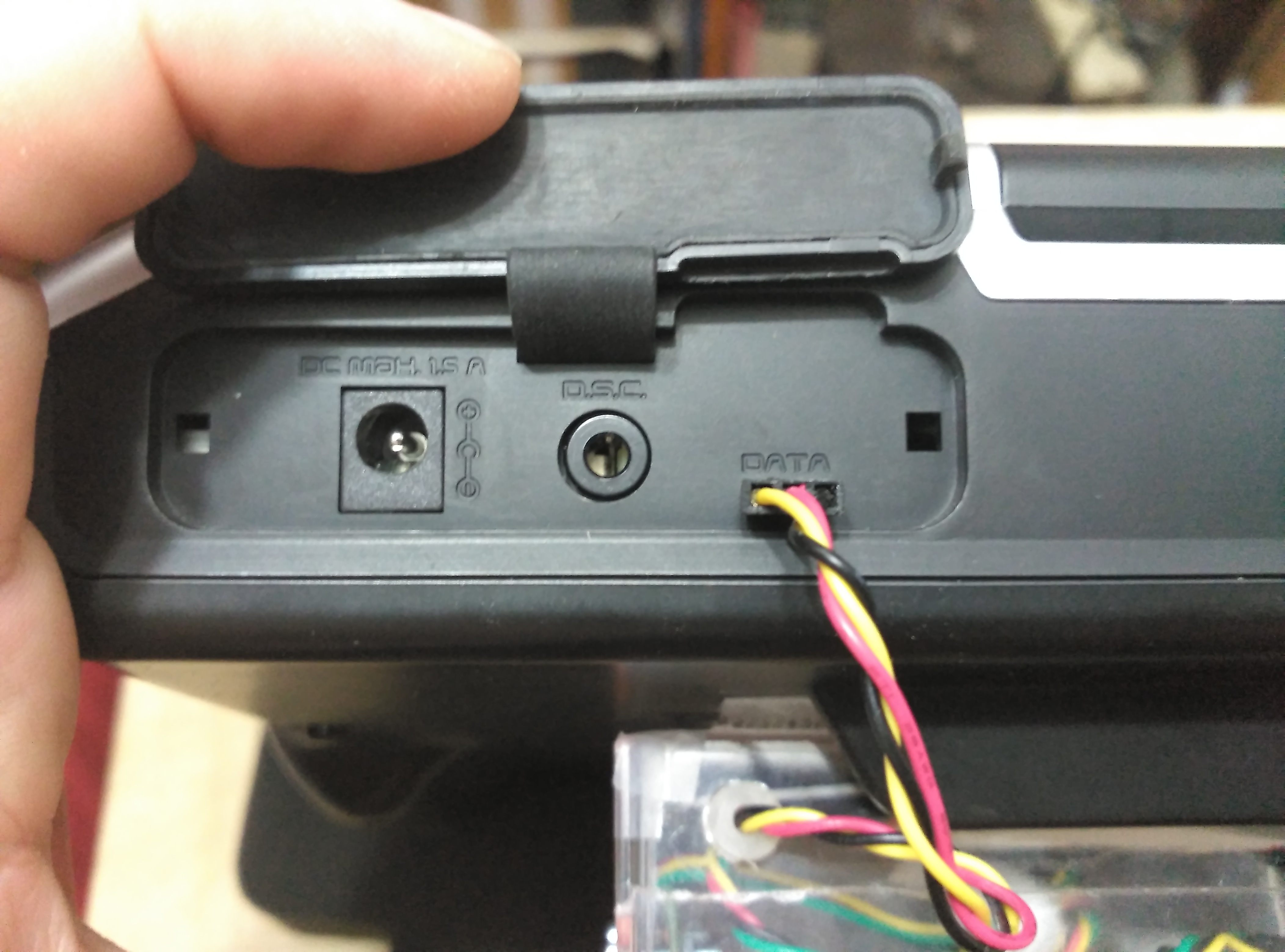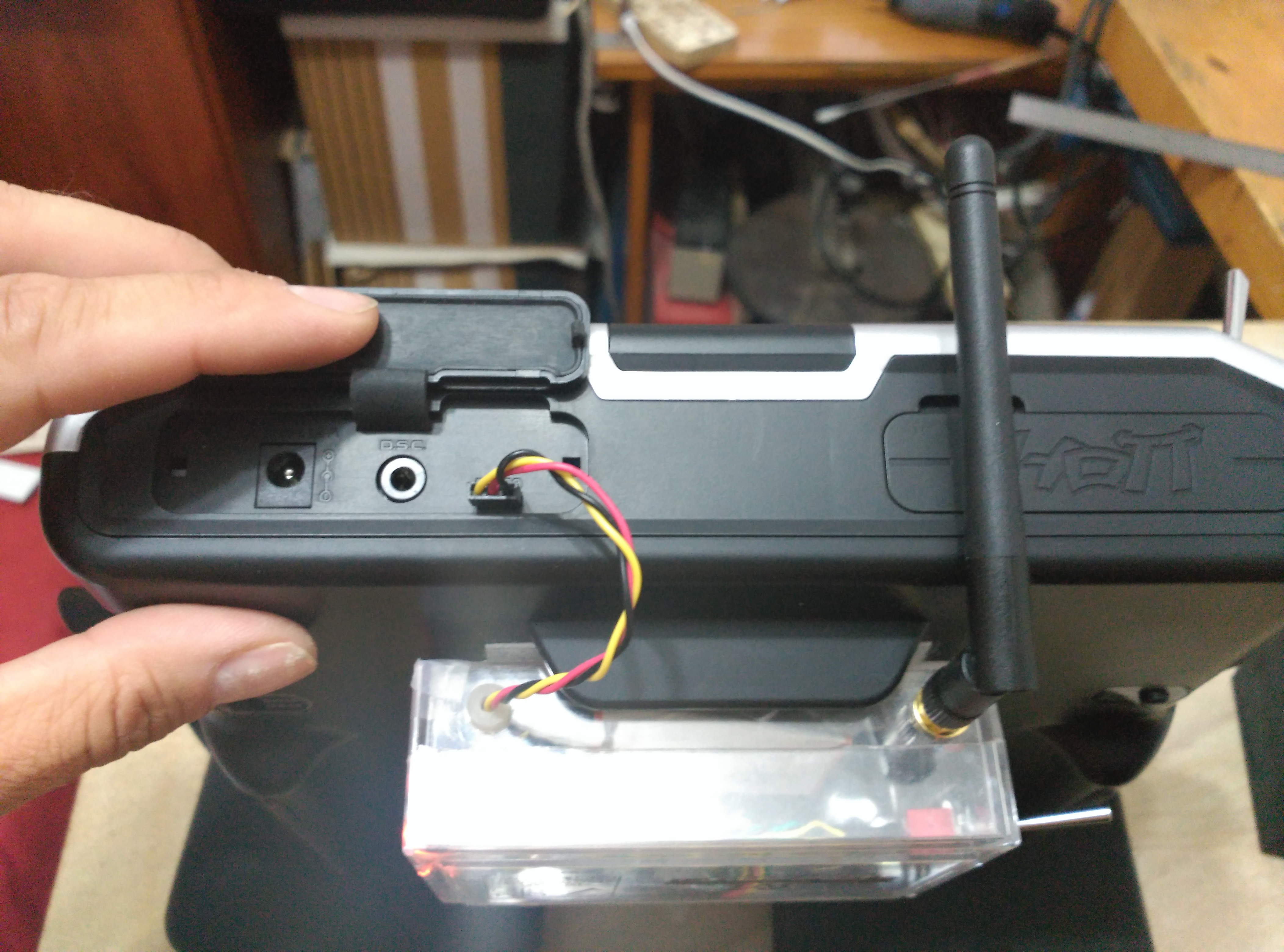 Para usar el módulo DHT lo tenemos que conectar a la entrada DATA de la MC-20 que se encuentra en la parte trasera bajo la tapa izquierda. Afortunadamente el conector de PPM del modulo es JR y tiene la misma forma que el de DATA de la MC-20 por lo que solo se puede conectar de una sola forma sin llevar a errores.