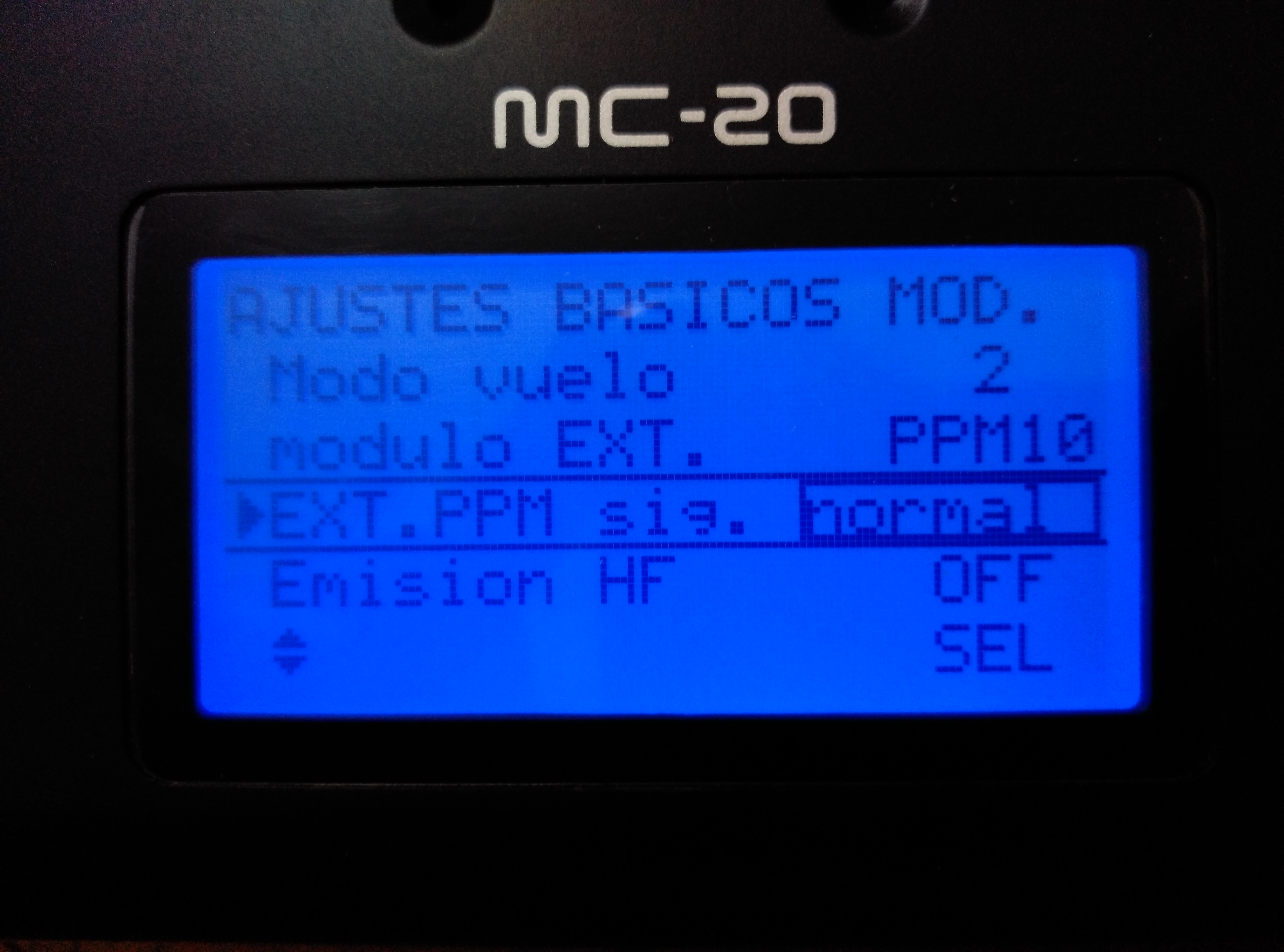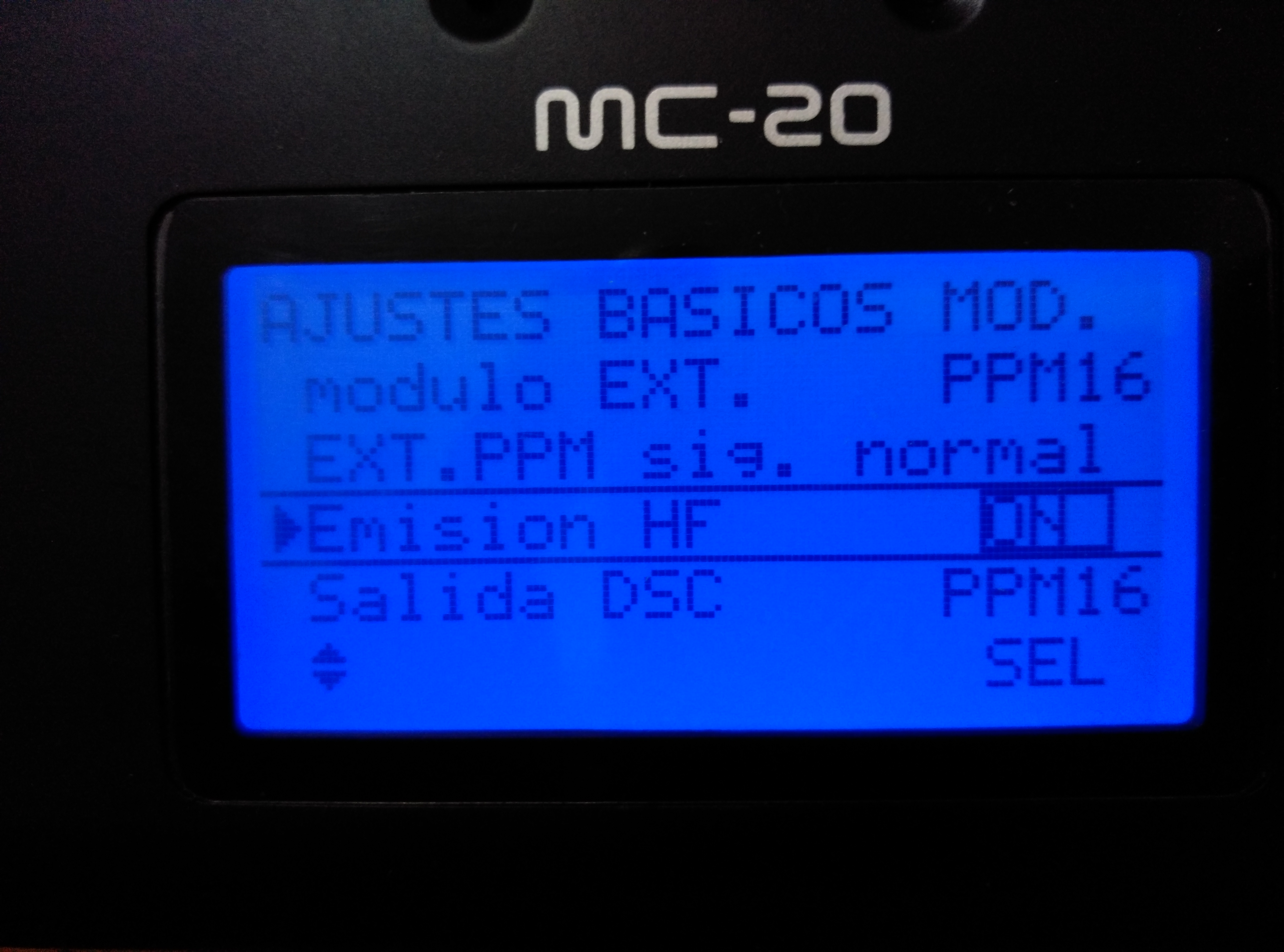 Para la configuración tenemos que entrar en el menu de “AJUSTES BASICOS MOD” Con la flecla abajo nos posicionamos en la línea de modulo, pulsamos SET y cambiamos “HOTT” que trae por defecto por “EXT”, para memorizarlo pulsamos set de nuevo.