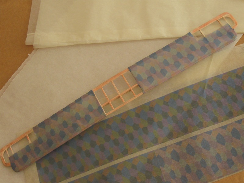 He puesto el papel delante del chorro unos segundos hasta que se arruga un poco, síntoma de que se ha humedecido. He repetido un par de veces la operación y he fijado el ala a una superficie con pesos por encima. Decir que yo tenso todo el ala a la vez (la superficie debe los ángulos adecuados para no deformar el ala)