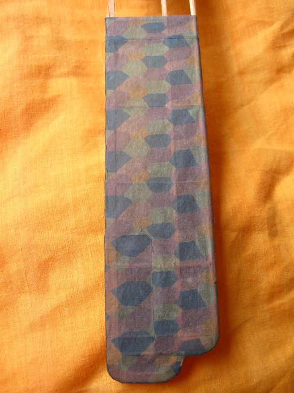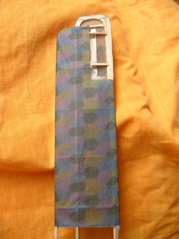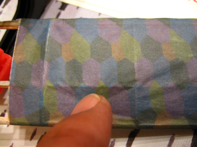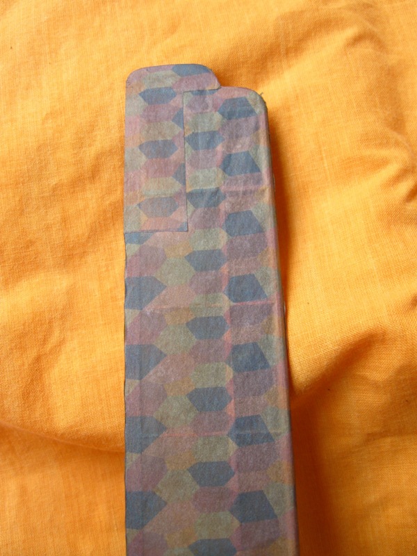 Como el papel es muy transparente y los colores los he hecho un tanto bajos de amarillo (heredados de un proyecto anterior) por la parte interna del papel (la que se pega a la madera) le he pasado con pasteles (esa especie de tiza que se utiliza en bellas artes).
