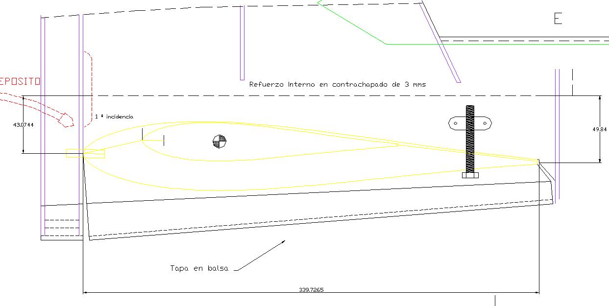 segun he acotado en autocad el ala tiene una cuerda de 339 mm y una incidencia respecto al eje de 6,8 mm, por tanto 100 x 6,8 / 339 = 2 %