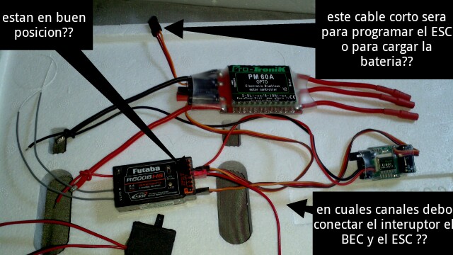 BUEN DIA AMIGO SOY NIVEL PRINCIPIANTE Y DESEO SABER COMO SE CONECTAN LOS COMPONENTES ELECTRONICOS DE MI RC F16 falcon 68mm 8 sevos compre este avion sin radiocontrol y sin ESC y bec, la radio futaba 8 FG 8 canales si alguien tredria la amabilidad de explicarme lo de la foto que agregue gracias saludos cordiales...