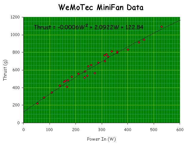 Ejemplo de uso de esta grafica. Tenemos un modelo que pesa 1.2k, y una mini fan 480, un empuje valido podria ser 1k (10N) segun la grafica la potencia necesaria serian 480W, si nuestro motor va a usar 3lipos (11.1v) tenemos que I = W / V, 480W/11.1v = 43A, (un pasote de consumo) tendremos entonces que buscar un motor en el programa de calculo que nos de ese consumo cuando pulsemos calcular, si en vez de 3lipos usaramos 4 (14.8v) el consumo seria de 32A (mejor mas voltios ¿verdad?)