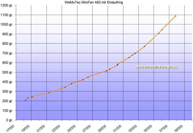 Algunos fabricantes nos dan el rango de empujes de sus EDF en Newtons, ej, de 2 a 14N (wemotec 480) de empuje estatico, pasa nada, 10newtons = 1k aproximadamente, en el ejemplo 1.4k, esto siempre suelen darlo con el intake ring puesto.