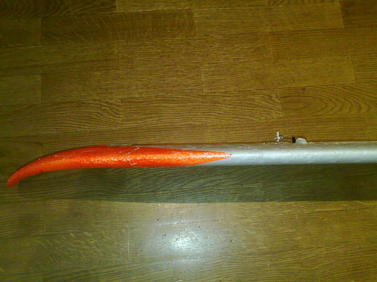 El apaño consiste en incrustar una tira de alumino de unos 40cm de largo, 1cm de ancho y 0,5mm de grosor en el tercio más exterior del ala, para evitar que se doble tanto a grandes velocidades. Yo de hecho he llegado a partir las puntas de las alas en dos ocasiones por hacer picados con el EG y luego levantar el vuelo de forma muy brusca. Todo sea dicho, que quizá el motivo de ambas roturas fueran ocasionadas por forzar mucho y por no ser suave en los movimientos (es decir, por ser un piloto poco experimentado), pero dado que el apaño es apreciable simplemete al ir algo rápido con el avión, cosa que todos hacemos aunque se trate de un planeador, lo cuento para que lo puedan usar hasta los pilotos más avanzados.