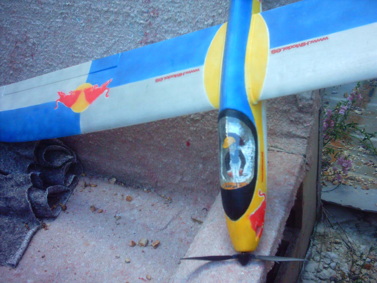 Mi EGlider empezó con el 400 con reductora, pero ese motor tiene tan poca “chicha” que un día de mucho viento acabó con un serio aporrizaje. Le fabriqué una bancada con un tapón de plástico, le reforcé el morro con fibra y resina de epoxi (queda mejor que el original) y le enchufé un brushless de carcasa giratoria (made in hong-kong) que ahora no hay racha de viento que pueda con él.