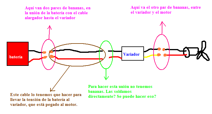 Vereis, estoy montando el easy, y me acaba de surgir una duda: he cogido el pack de escobillas en Himodel, con lo cual, tengo cuatro pares de bananas, dos para conectar batería-variador, y otras dos para conectar variador-motor. Mi duda es que, como tengo que alargar los cables entre variador y batería, para ese alargador, ya necesito las cuatro bananas. Cómo habéis hecho vosotros? Puedo soldar directamente los cables del alargador del variador, como pongo en el dibujo? Lo cierto es que no tengo ni idea de cómo hacer...