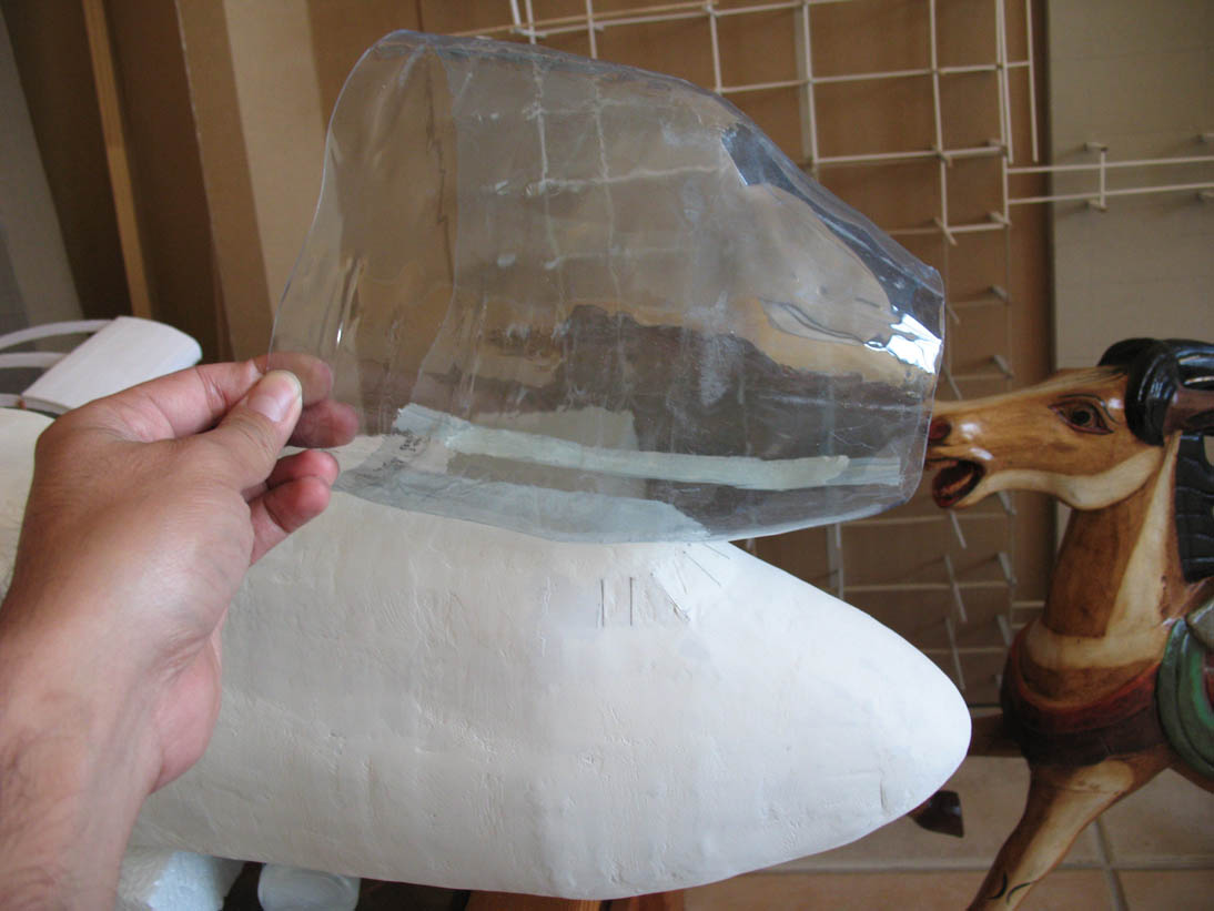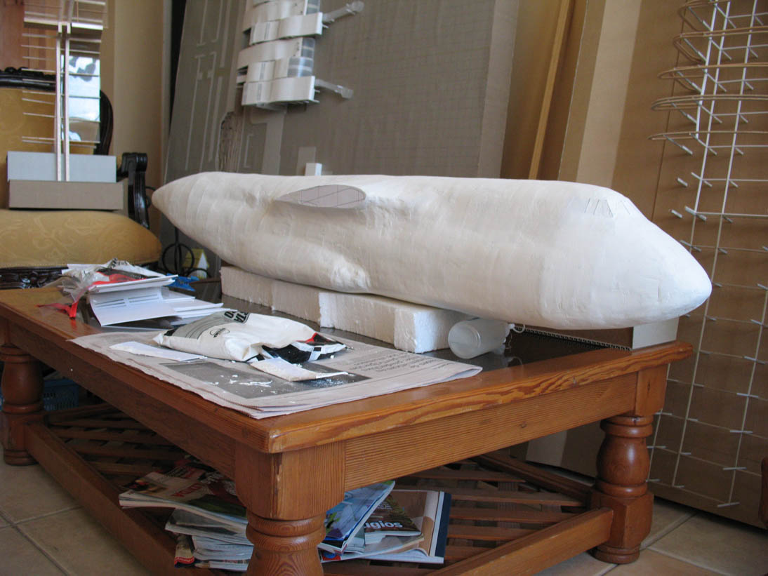 la verdad es que ha sido una dificil tarea, primero conseguir buenas vistas planimetricas del avion porque hay muy pocas y malas. luego confeccionar una maqueta 3d en autocad para, sacar las costillas del avion en aislapol o plumavit (corcho blanco) unirlas y enmasillar para luego lijar mucho y pulir. cuando estuvo listo puse la primera botella en el molde para calentarla y que tomara forma pero estas al comprimirse lo hacen con tanta presion que comprimio el modelo. el corcho era muy blando para aguantarlo, asique tuve que hacer un molde negativo en yeso para luego sacar un positivo en yeso piedra, finalmete este es durisimo y pesa el modelo total 20kg. las botellas que ocupo son las de 5 litro de agua mineral.
