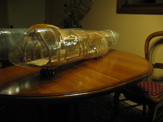 he aqui mas fotos en la semana saco alas y estabilizador. el peso de los fuselajes es de 614 gr para la maqueta en carton y botellas, mientras que la estructura en madera de balsa alcanza un peso de 470 gr. alguien tiene idea si va bien en este momento con el peso solo del fuselaje en 470 gr. ??? son 1.5m. de longitud las alas tendran tmb 1.5m. en envergadura