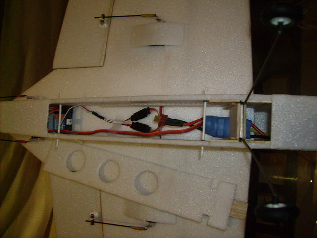 como puedes ver la bateria y el motor van los mas a proa posible, y las alas tienen doble diedro y gomas en las alas, junto a un diseño de fuselage muy simple pero rigido