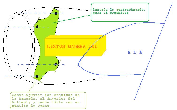 Por otro lado, el tema de las carenas "Actimel": vamos a ver si encontramos alguna opción viable y elegante; por un lado puedes utilizar un bote más grande que el de Actimel, para poder ocultar todo. Por otro lado, puedes mantener el Actimel, y hacer un postizo -adjunto alguna idea- para ocultar el variador y otros elementos (no es para nada aconsejable prolongar los cables de alimentación, hasta que te lleguen al fuselaje)