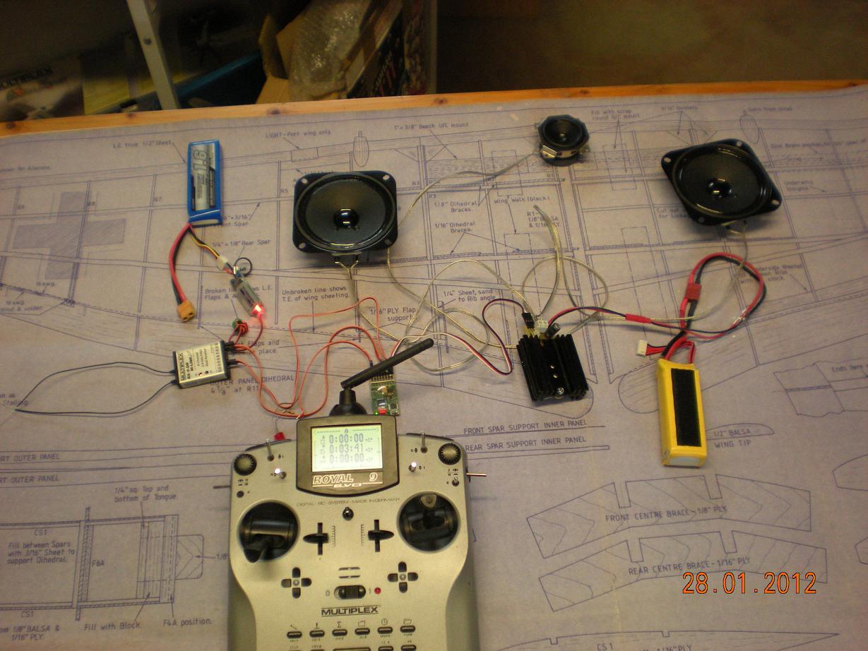 El altavoz pequeño pensaba ponerlo en el morro cerca del motor para dar mejor efecto, pero posiblemente, disponga 2 altavoces Visaton de 10cm de diámetro y 8ohmios en paralelo, uno en cada semiala.