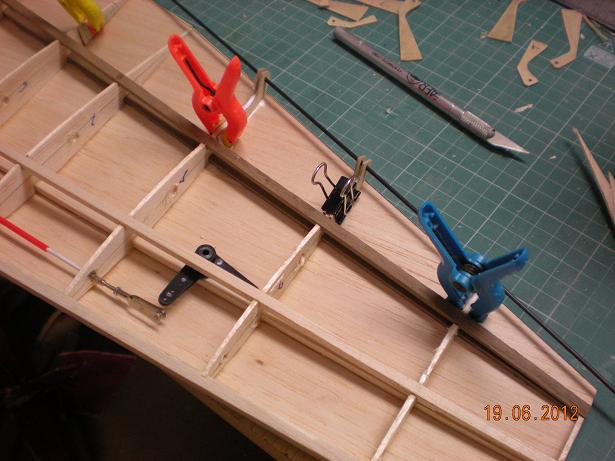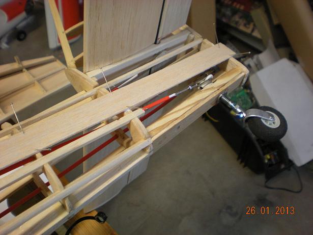 Antes de enchapar el intradós hay que poner las bisagras y transmisiones de las superficies de mando.