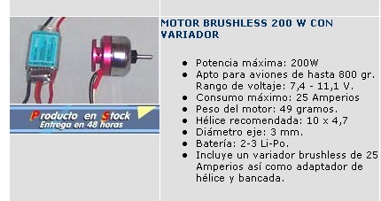 Similar al motorcillo de 200 W que tienes, Juanma lo vio volar en el velodromo de Valencia en un Flite - Strike aligerado a poco mas de 600 gramos con todo. El primer vuelo lo realizo muy bien de traccion y velocidad, solo que estaba corto de plomo de contrapeso en el ala, en el segundo intento , por cambiar de lipo ( una un poco mas grande)recien cargada , no se le controlo el C.D.G. y se le intento probar en figuras y en un PEAZO CUCHILLO se metio para dentro siendo irrecuperable y desintegrandose toda la liviana estrctura de balsa de las alas( Rebentao por dentro).