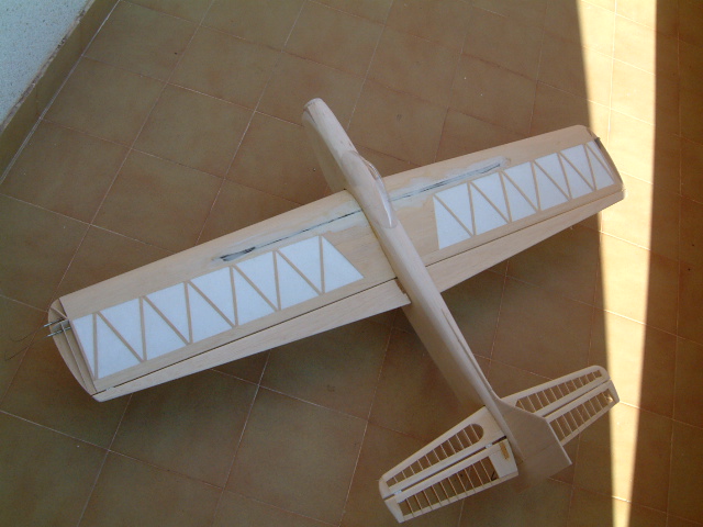 El estabilizador es de palitos y costillas y los elevadores son "alas de combate clásicas a escala" (el que haya construido una warmonger o similar sabrá a que me refiero, una vez empapelados la relación rigidez-peso es impresionante).