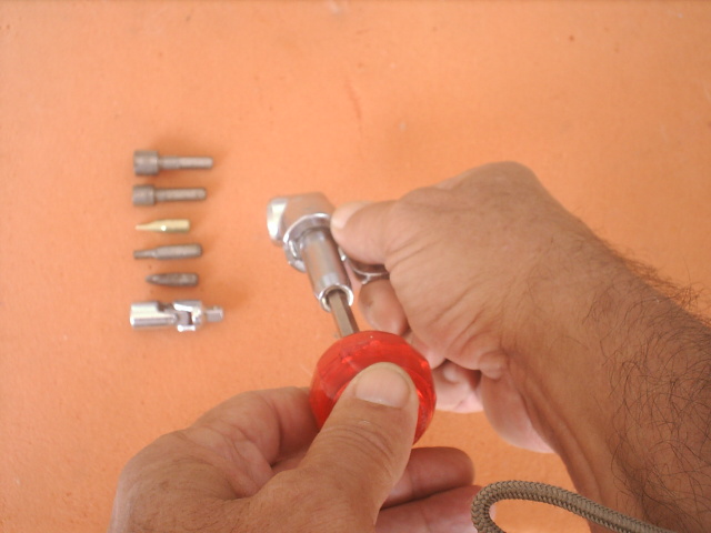 Tatopirato, estás equivocado, es la ideal para ese uso, en la herramienta gira el eje, mientras la mantienes firme con la mano, es como un cardan, en la parte izquierda niquelada larga pones el mango de un destornillador de quita y pon, una carraca o lo que quieras, y en el extremo de la derecha puedes poner una punta allen, de estrella, plana o la que quieras, y mantienes firme la herramienta con la otra mano por el centro.