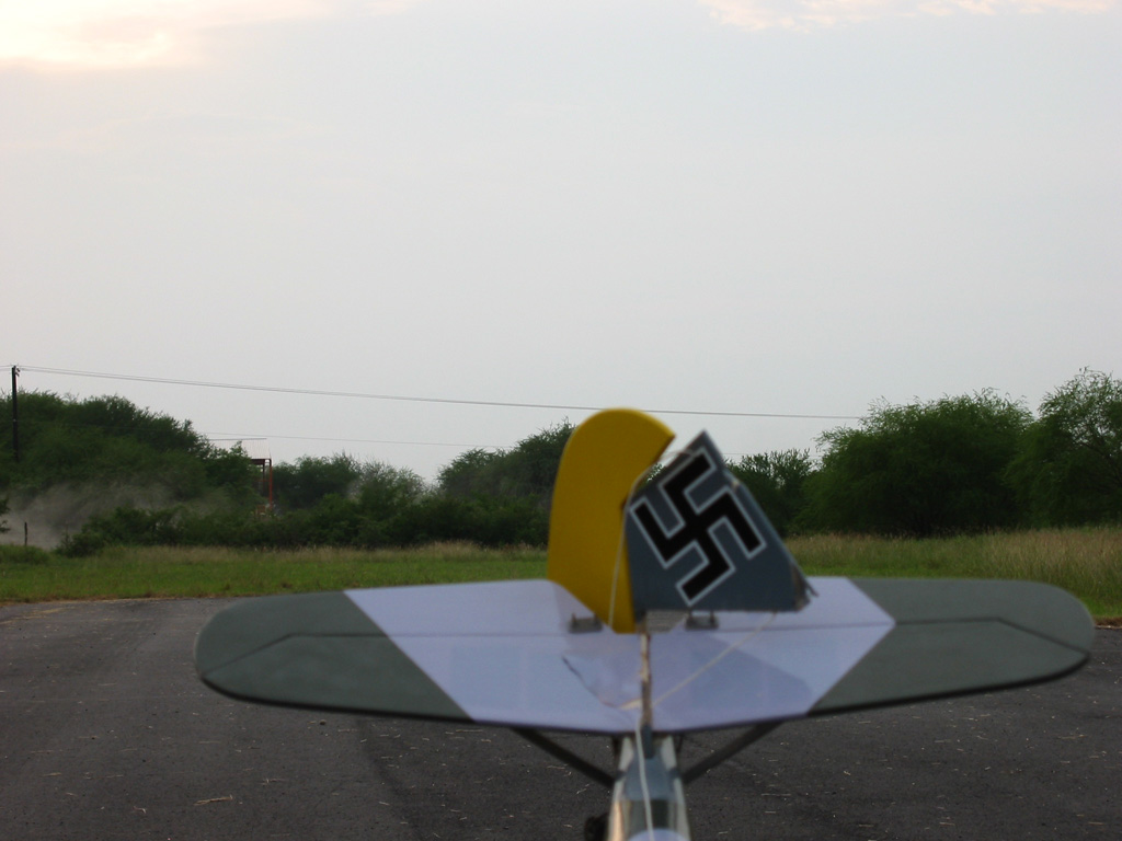 El dia de hoy en la pista realizaba pases bajos con el "Meche" de kyosho, cuando ya me perfilo para aterrizar, segun mis calculos ya habia pasado los cables que estan en la cabecera de la pista, cuando de pronto el avion se frena y hace un extraño, por una fraccion de segundo pense que habia sido una interferencia al radio pero al escuchar el sonido del golpe cai en cuenta que habia pegado con los cables.