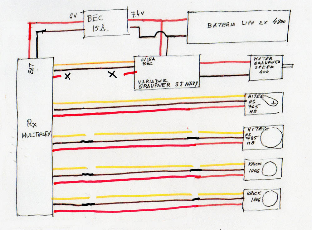 Si debo montar el BEC externo entiendo que vale como estaba dibujado en el esquema anterior. Pongo nuevo esquema sin el BEC exterior y con el positivo a la entrada de batería del receptor.