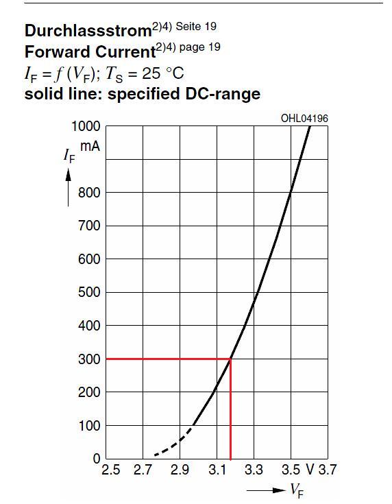 Ya conozco la Intensidad del circuito 0,35A, ahora me voy a ver la grafica I=F(V), y veo que le corresponde una Vf de aprox. 3,2V. Tb me lo indica el datasheet en la pag.4, tensión típica a 25º.