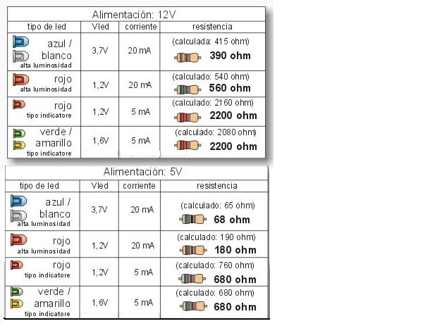 lo que ha añadido juan, es una tabla de valores de resistencias en la que vienen los valores para poner directamente un led de cada tipo a 12 voltios o a 6 voltios y no tener que hacer calculos ( es que somos muy vagos :mrgreen: ) esta bie porque incluso te pone los codigos de coloro para que no nos confundamos :roll: