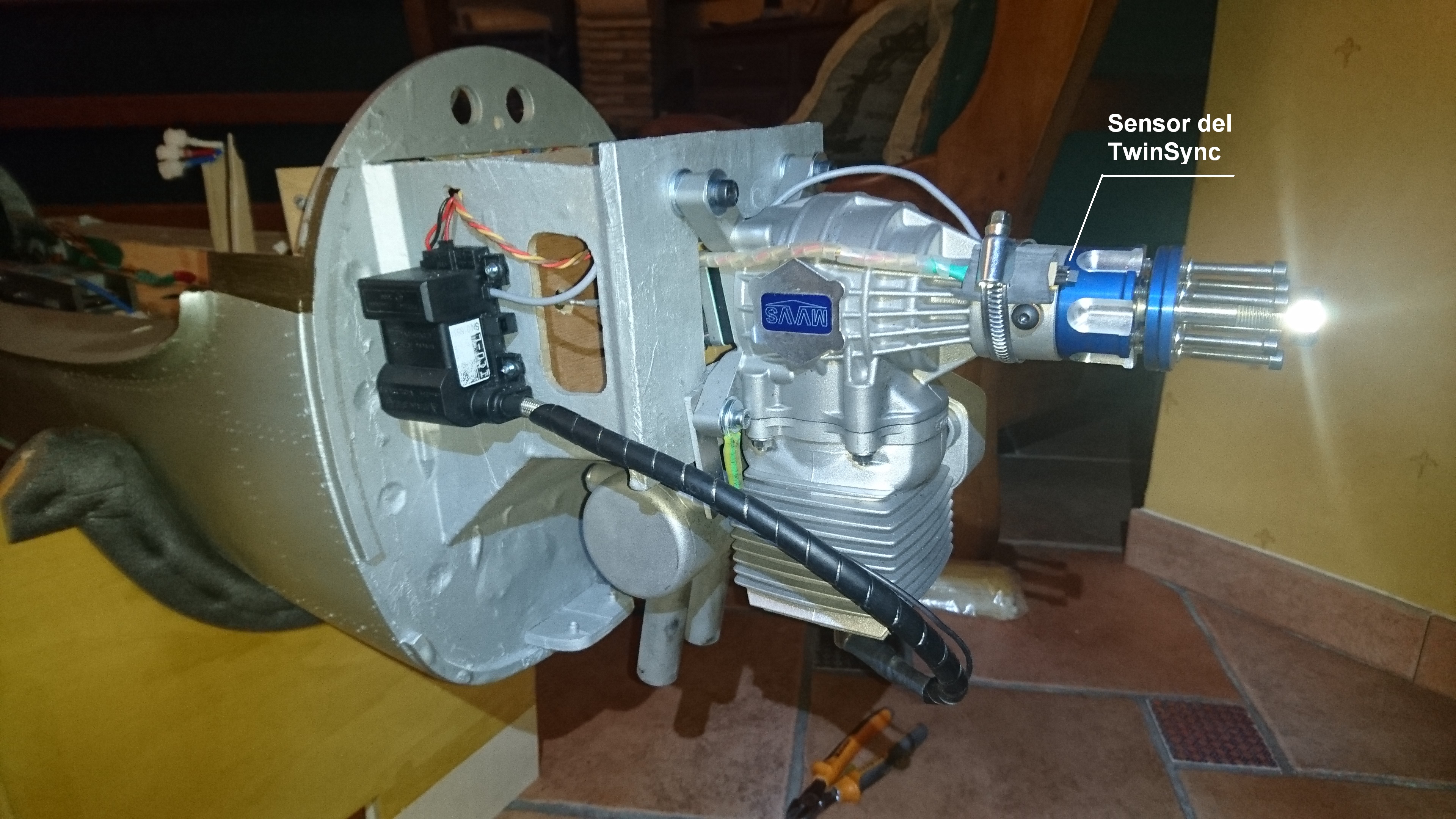 Os muestro un par de fotos de los motores colocados. Por el tipo utilizado, no se presenta ningún problema de espacio. Os he marcado el sensor del sincronizador de los motores, que es lo más relevante de la instalación.