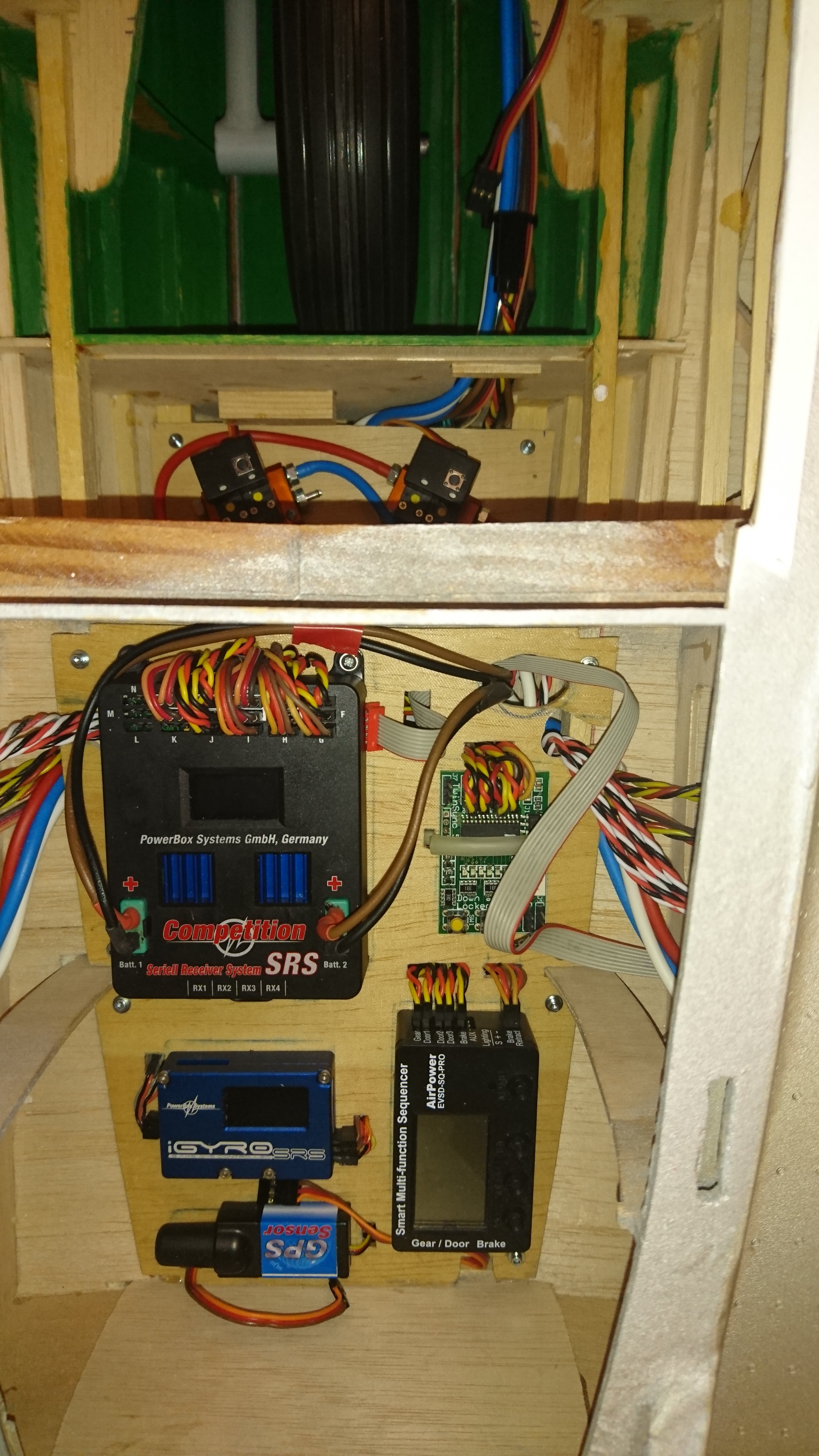 He optado por instalar un giróscopo (PowerBox i-Gyro SRS®) con GPS, para controlar, al menos, los dos ejes más críticos (alabeo y deriva) ante una emergencia motivada por un fallo de motor, y contribuir, de paso, a la estabilidad del modelo a cualquier velocidad; también lo he programado para gestionar la profundidad. Va permanentemente conectado en vuelo y puede controlarse mediante un interruptor desde la emisora.