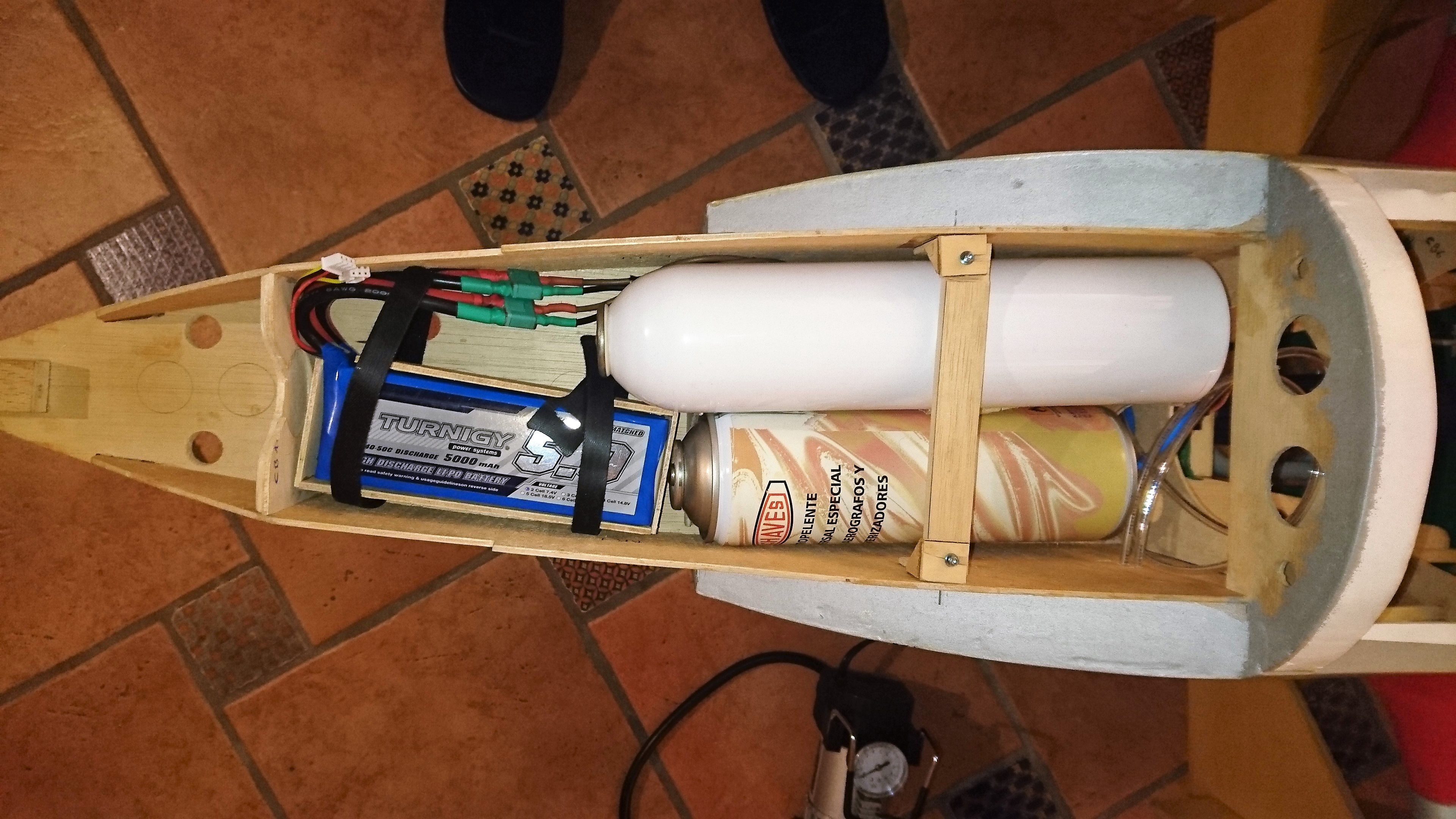 La aviónica se aloja holgadamente en el espacio que hay tras el piloto, bajo el equipo de radio simulado del P-38 real, habiendo empleado unos 20 metros de cable trenzado 3 x 22 AWG para las interconexiones y dos baterías para su alimentación, de 5000 mAh cada una, ubicadas en la parte delantera de la góndola. Es preciso tomarse su tiempo para que la instalación sea lo más limpia posible, dada la ingente cantidad de tubos y cables que convergen en este lugar.
