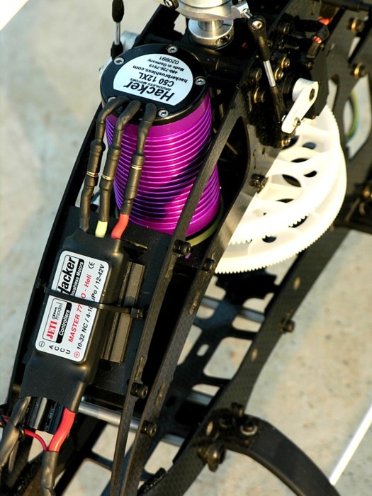 de momento le he montado tres servos DS821 en el ciclico, un tango 45-10 con un jazz 80-6-18, el gyro es de CSM un 720 SL con servo de JR 8700G, el bec es el de 3A de aling con una lipo 7,4v de 2200mah, la bateria es 6s de 5000mah de TP.