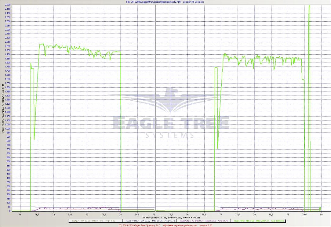 Practicamente vuelo los 4 minutos que volaba el 600. Abajo hay un par de logs, muy parecidos a un 600. Son vuelos de prueba bastante suaves, bueno, yo normalmente no vuelo mas duro que eso. Algun susto me dio porque el heli a veces reacciona distinto a lo esperado, no se si por los optimizadores de Mikado que estan adaptandose o por la baja carga del rotor.