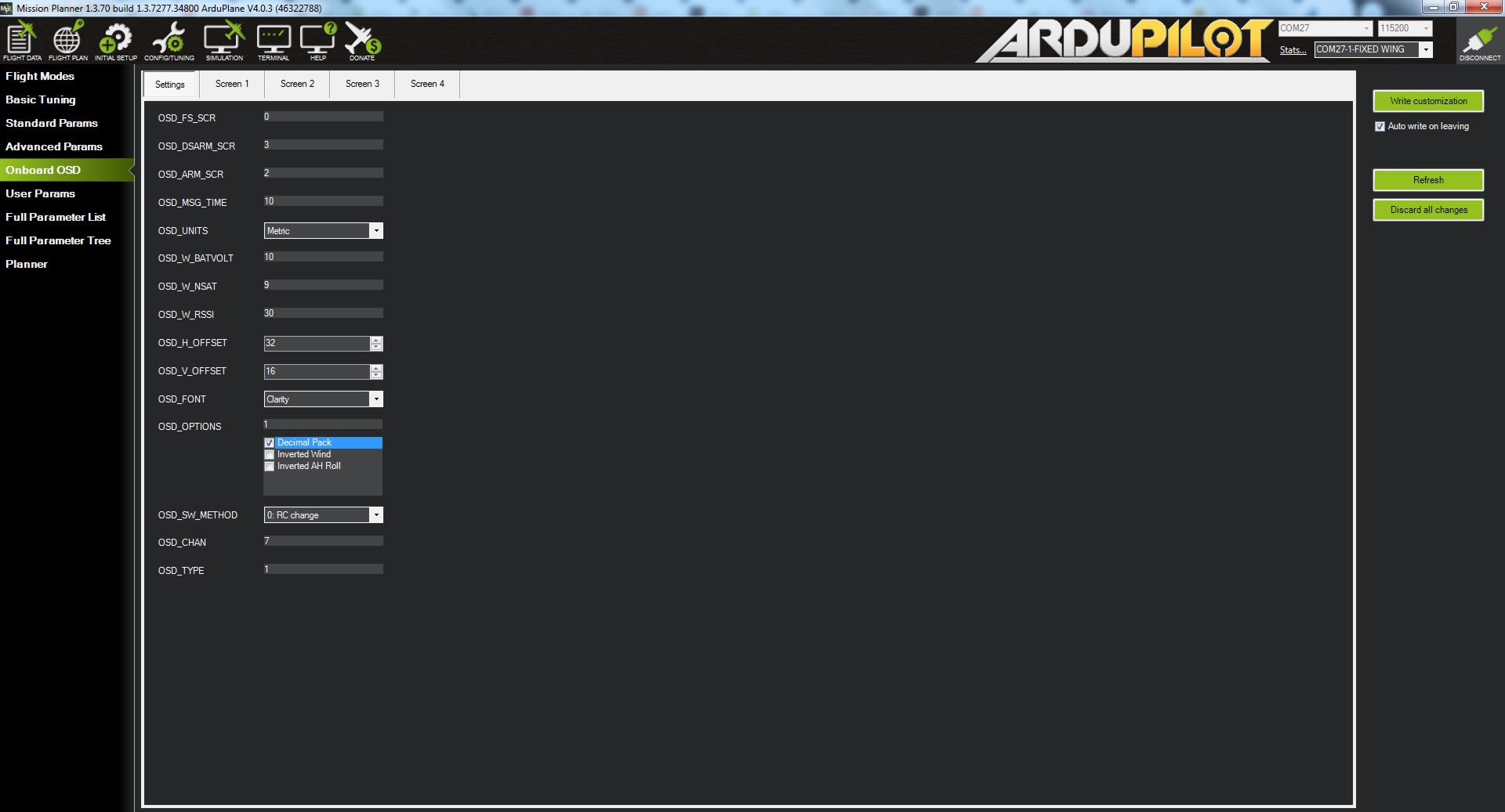 - OSD_DSARM_SCR: Con él, indicamos la pantalla que se nos mostrará cuando desarmamos nuestro avión. Por defecto 0 deshabilitado. Nosotros en la pantalla 4 configuramos las estadísticas del vuelo.