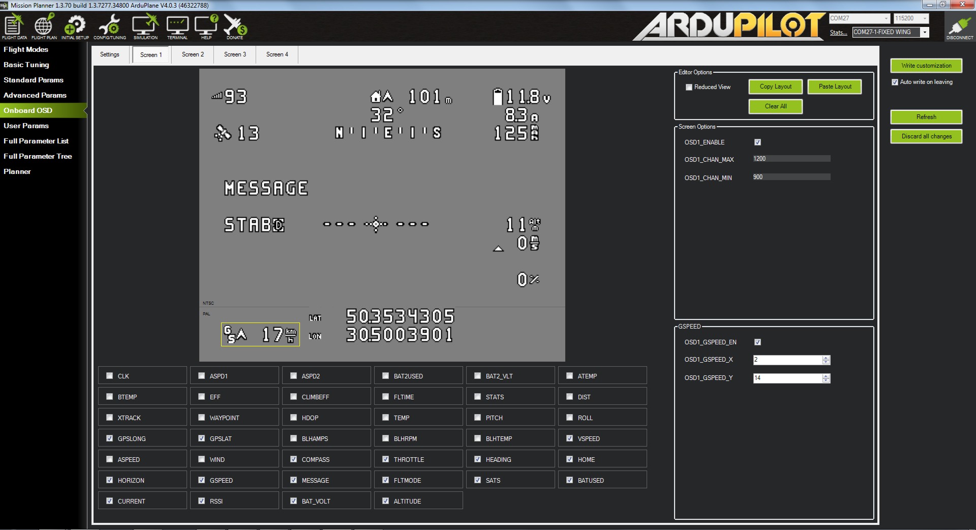 Si nos fijamos en la zona de Item Options (parte inferior derecha) el dato marcado corresponde al GSPEED, nos aparece su parámetro seleccionado (OSD1_GSPEED_ EN), y las coordenadas X (OSD1_GSPEED_ X) e Y (OSD1_GSPEED_ Y) de su ubicación.