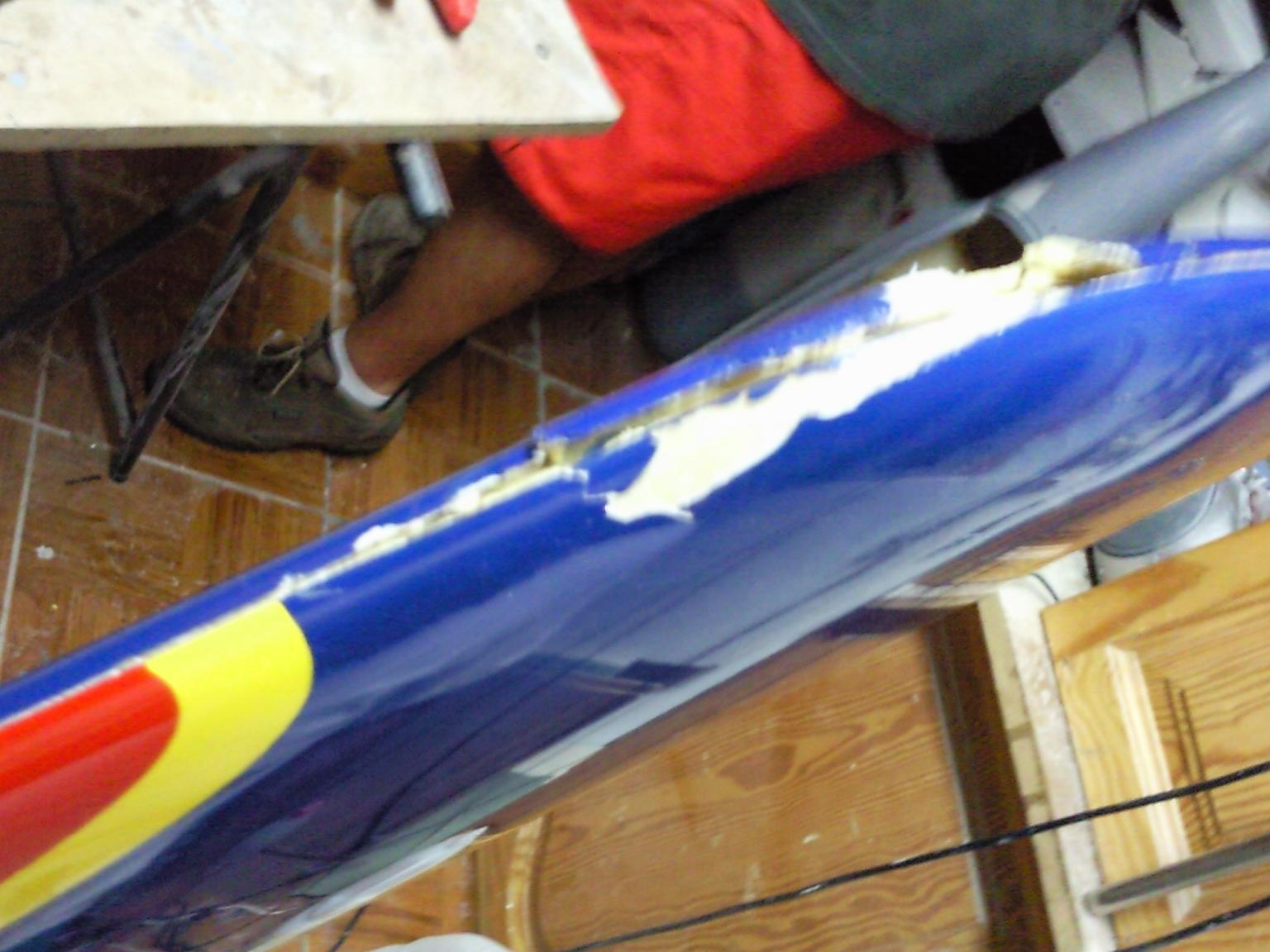 Tomo sin más problemas y al llegar a la zona de parking, apago turbina, enfriamiento y anotación de temperaturas y tiempos en el logbook. Eduardo, cuando llega el avión, me dice ¿ Mira el alerón derecho ! Efectivamente unos 2 cm levantado; por eso se iba a la dercha. Y al levantar la vista, veo en la punta de ala derecha un trozo que tiene levantada la pintura. Se acercan los críos y ven un pequeño boquete en la parte inferior del ala y el borde de ataque un poco abierto.