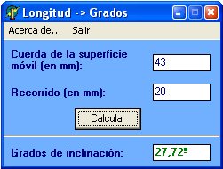 Hola a todos, gracias las explicaciones de Carlos A. y Maka ya entendí como hacer las mediciones, asi que hice un pequeño programita que quizás os sea también de utilidad, se trata de un conversor de longitudes a grados, es decir, le pones la cuerda de la superficie móvil y el recorrido y calcula a cuantos grados corresponde dicho recorrido, así será más fácil hacer los ajustes de las partes móviles.