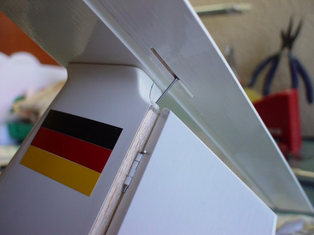 El montaje del timón de dirección no presenta dificultad alguna. Simplemente hay que tener cuidado de que las bisagras queden bien alineadas. Los pines de las bisagras se pueden quitar para reparaciónes o cambiar el timón entero de ser necesario.