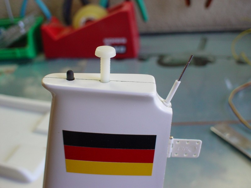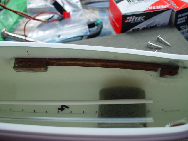 En primer lugar tenemos la colocación de la transmisión del timón de dirección. Es una operación sencilla pero entraña cierta delicadeza a la hora de abrir el orificio para pasar la transmisión. Da pena cortar un fuse tan majo pero es necesario. Tras darle unos cortes con la Dremel, he agrandado el agujero con la lima de cola de ratón inclinandola para que la transmisión salga lo mas paralela posible al fuse.