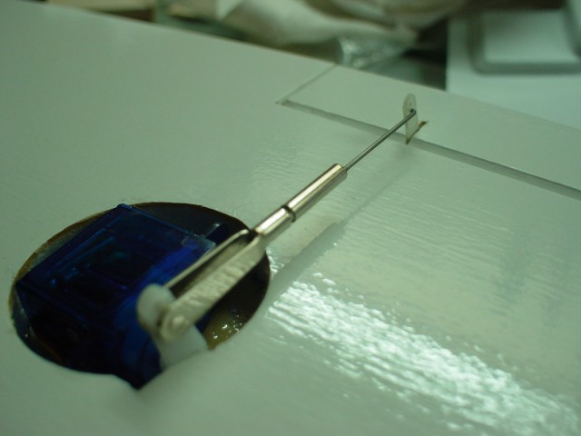 El servo pegado con cinta de doble cara y el mando ya instalado. En lugar de utilizar los horn suministrados por FVK, he preferido poner los de fibra que venden en Aircraft World.