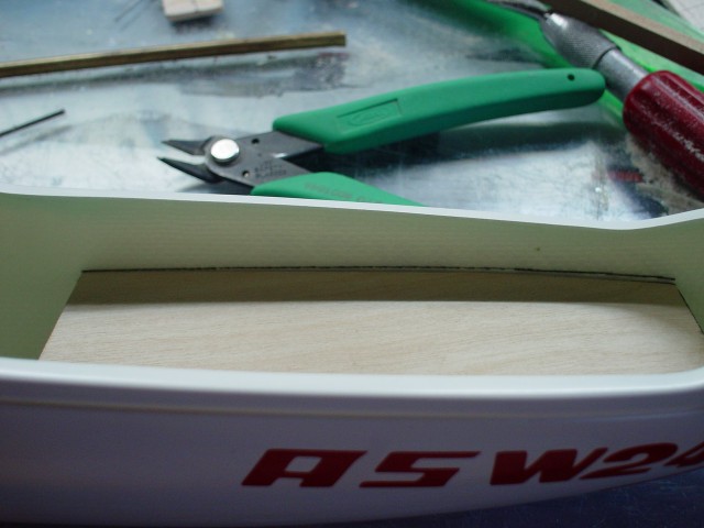 Se corta a ras con cuidado de no rozar el fuselaje. Un corte aproximado ya que luego se remata con lija antes de pegarlo en su sitio.