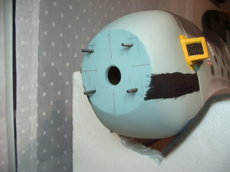 En este modelo he empezado por la colocación de carena y motor. Lo primero ha sido abrir los huecos de los escapes (muy pesado, la fibra aquí es bastante gruesa) para que ayuden en la refrigeración del motor y ensuciarlos. Para ensuciar los escapes, primero una mano de pintura negro mate, y con la pintura todavía húmeda, espolvorear por encima un poco de sal de mesa y dejar secar.