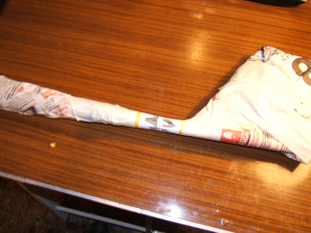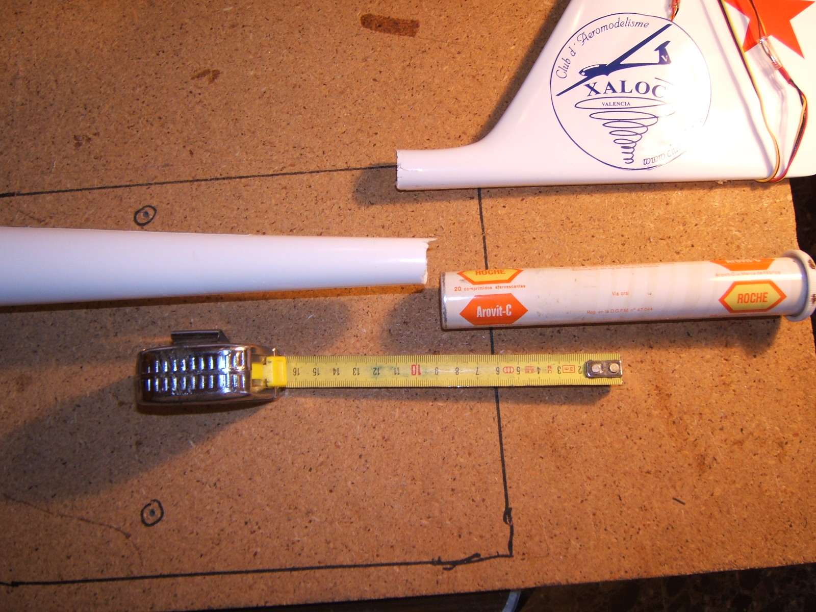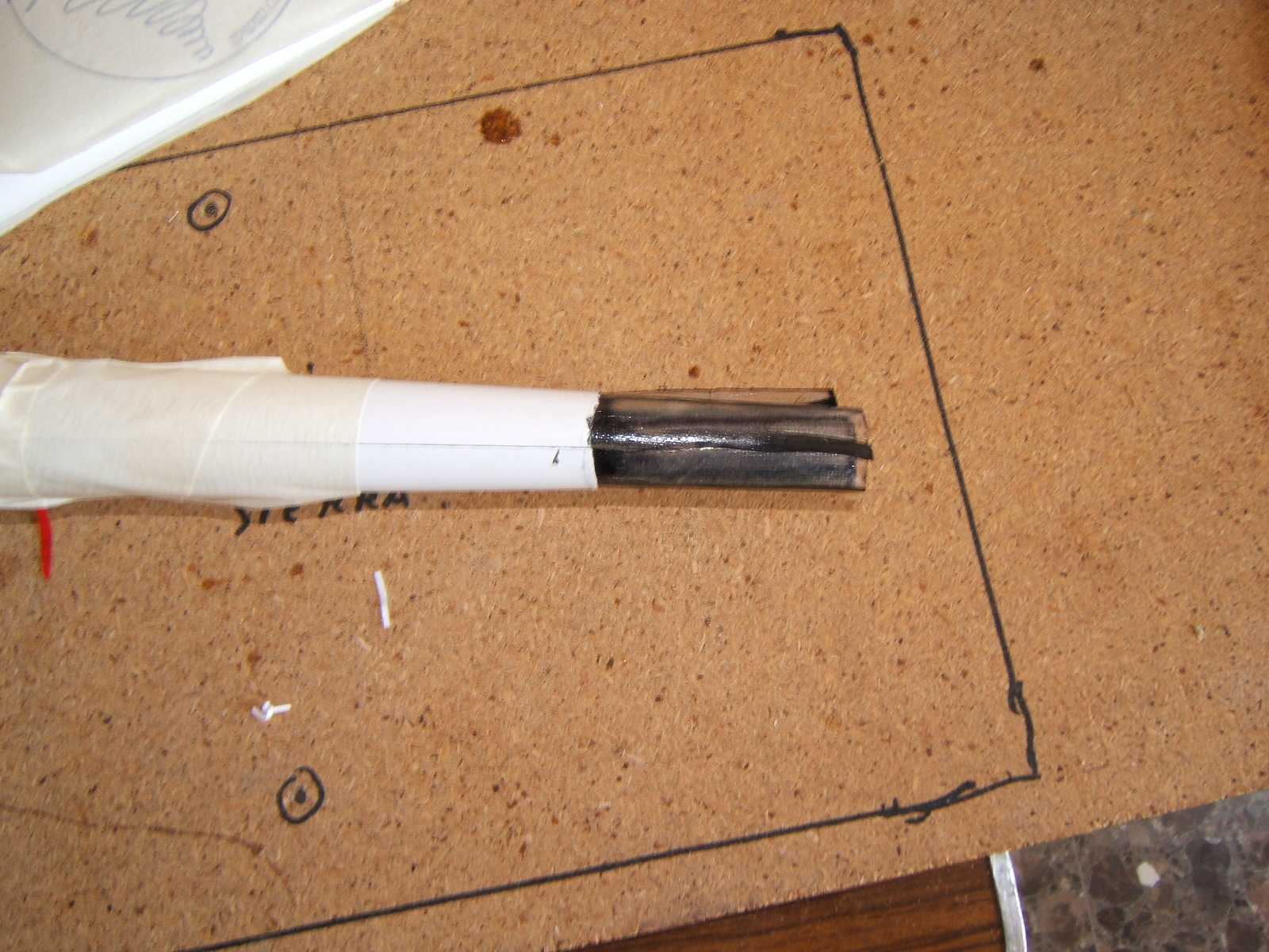 Conseguimos un tubo de un diámetro mayor que la rotura, para enrollar el sanwich de fibra y carbono en él. Aquí tengo una corrección sobre el procedimiento del compañero, si la rotura es grande puede servir un tubo de cartón como los del pape higiénico, pero si la rotura es pequeña como en mi caso, es mejor hacerlo simulando la forma de la sección rota, pues al tener forma cónica y ser el diámetro tan pequeño, no se desenrosca los suficiente cuando lo metes en el fuselaje, adoptando una forma tubular que no se adhiere en la parte más ancha. Por ello es mejor que el tuvo sea cónico para que ya moldee la forma.