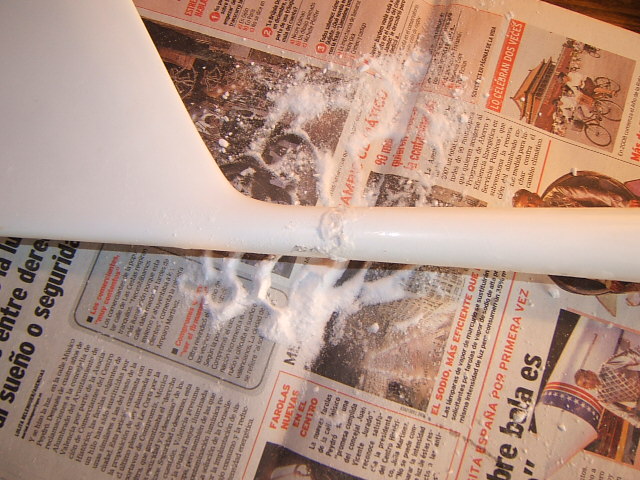 Cuando seque (yo lo dejo 2 días), ya podemos hacer el acabado. Primero hay que sellar las rajas y rellenar los trozos donde se ha perdido fibra. El compañero usa ciano para las rajas y masilla de carrocero paralos huecos.