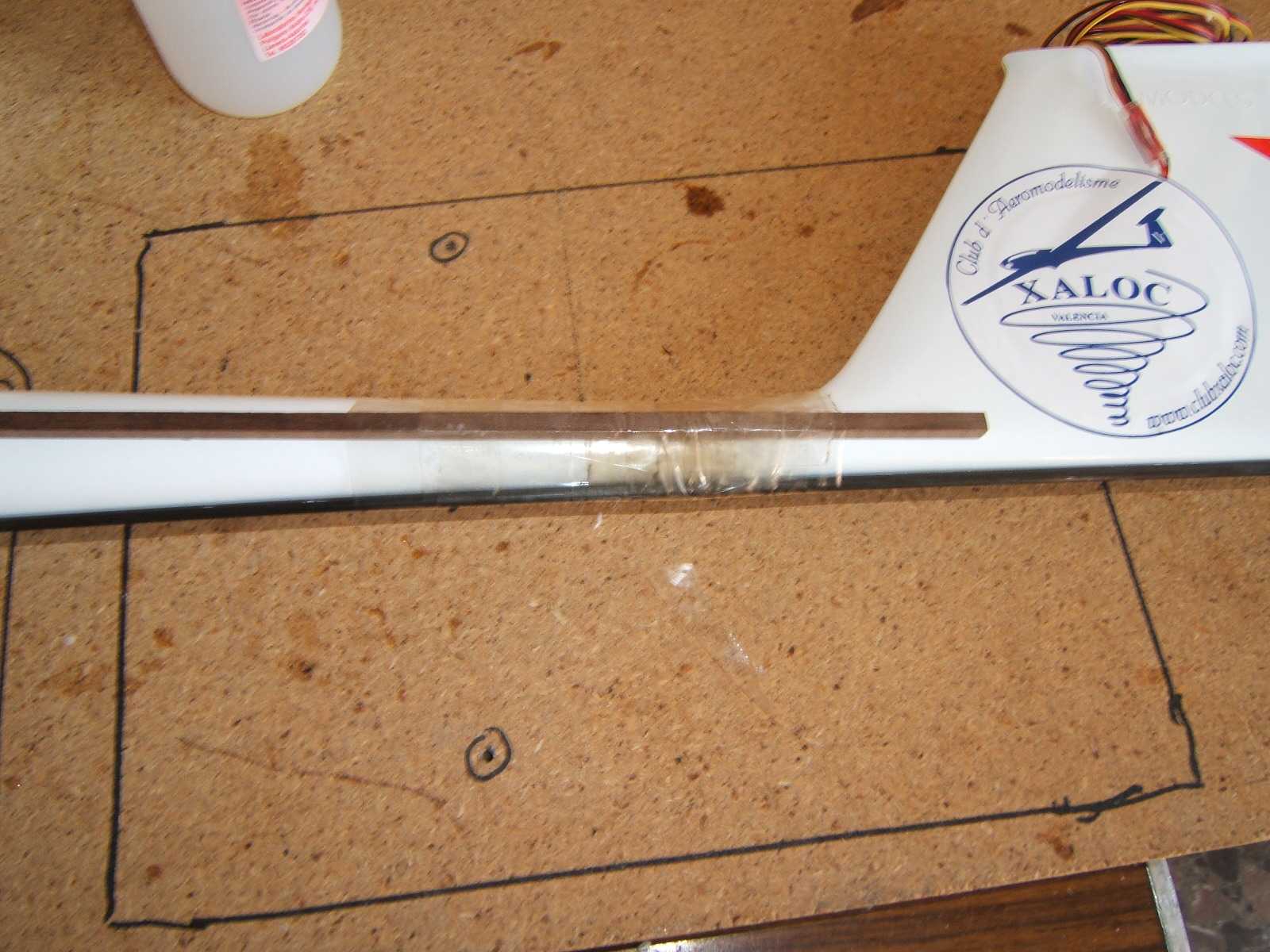 Todo el conjunto lo fijamos para que quede alineado el fuselaje. Yo he usado una varilla de carbono por debajo (pues la panza es plana) y unos largueros de haya. Primero alineé el corte con cinta de precinto, buscando la rebaba de construcción del fuselaje y luego fijé la varillas con la misma cinta (transparente, para ver el corte). La cinta se pone cerca del corte para que la tensión de los extremos de la varilla, donde el fuselaje se abre, no nos afecte.