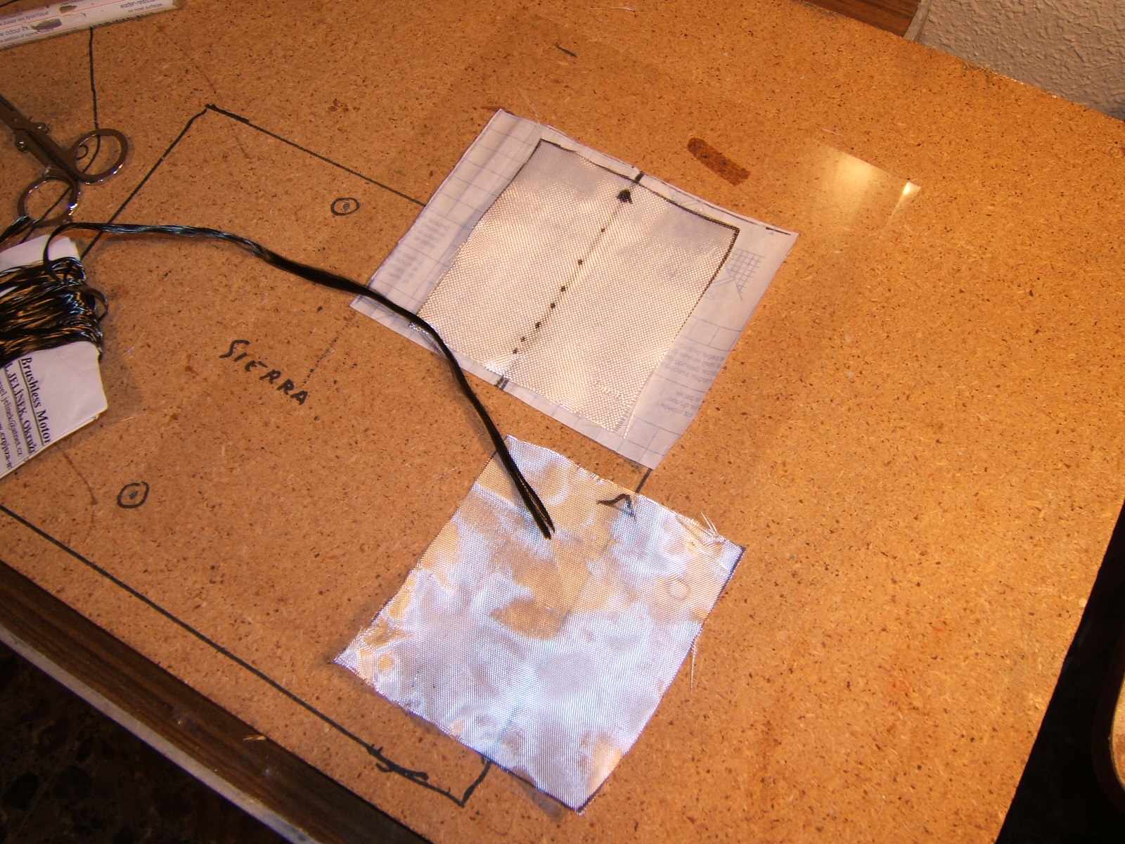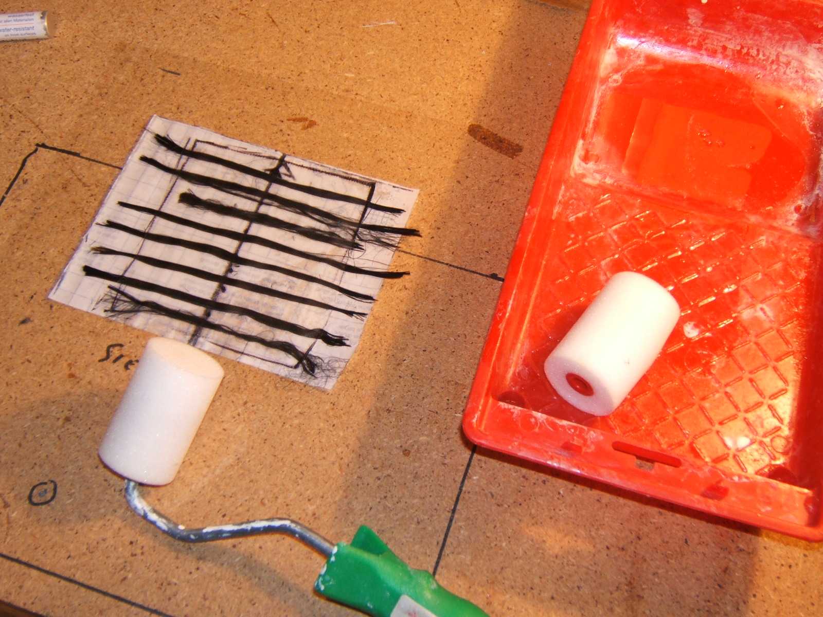 Cortamos dos piezas de fibra del tamaño anterior, y varias mechas de carbono más largas (unos 15 cm). Yo dado lo delicado de la zona he usado fibra de 85gr-mechas-fibra de 50gr, pero de normal con usar dos de 50gr sobra. José Juan sólo usa una tela base y sobre ella las mechas, pues lo que da fuerza al conjunto son las mechas de carbono, la fibra sólo es para fijarlas.