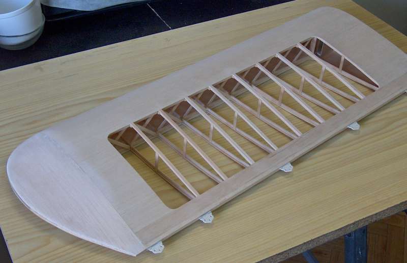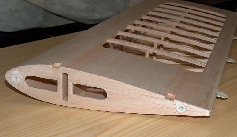 Los bordes de ataque y de fuga hay que construirlos con un listón de 1,5 x 10 mm ranurado y pegar listones por ambos lados de 5x10 para el borde de ataque y de 5x5 para el borde de fuga