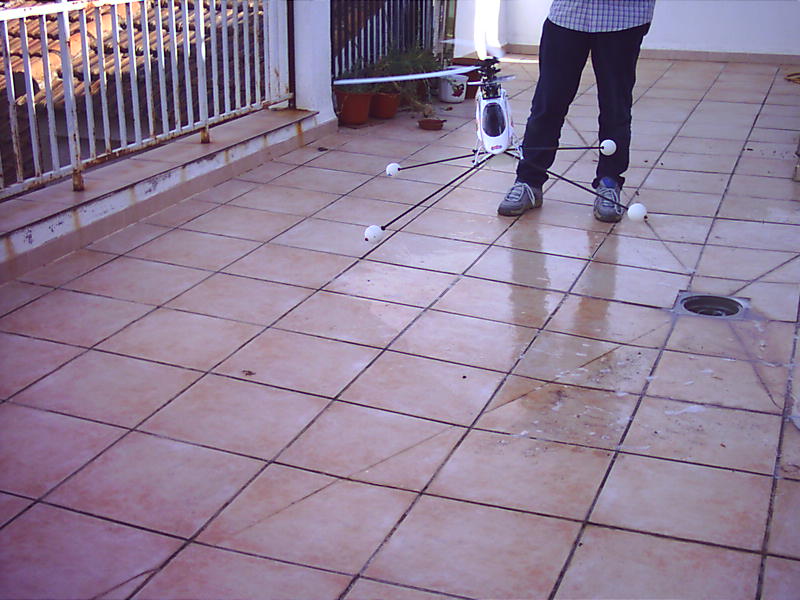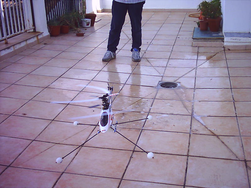 Le he puesto un tacatá casero con varrillas de carbono y pelotas de ping-pong en los extremos, era la primera vez que volaba un Heli aunque ya tenia bastantes horas de simulador, y no había a mi alrededor nadie que me pudiera aconsejar ni nadie que me dijera si todo estaba bién centrado y esas cosas, así es que imaginaros mi acojone.