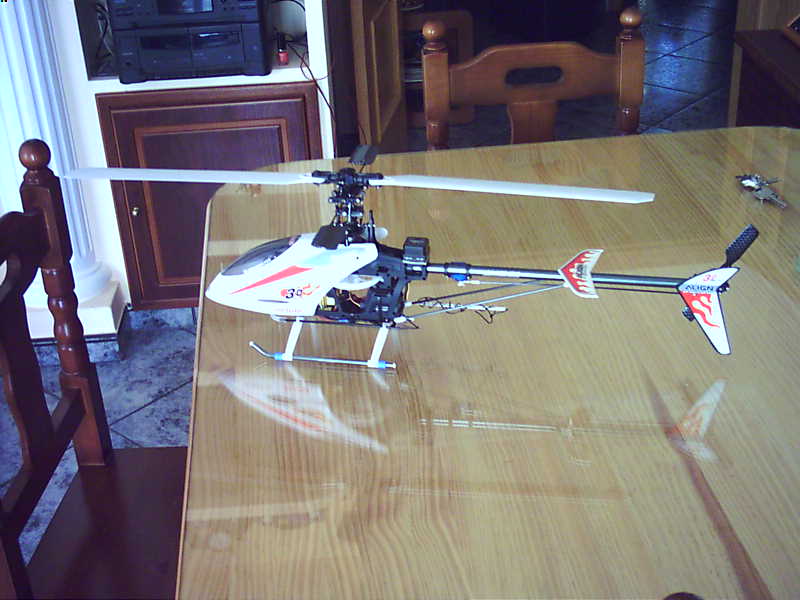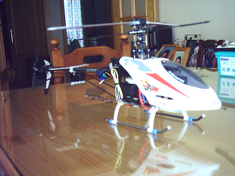Ahí van unas fotos del heli terminado, y otras que le ha hechado la parienta esta mañana en la terraza de casa con el tacatá casero, no podia resistirme a volarlo otro ratito antes de ir a currar ... :D .