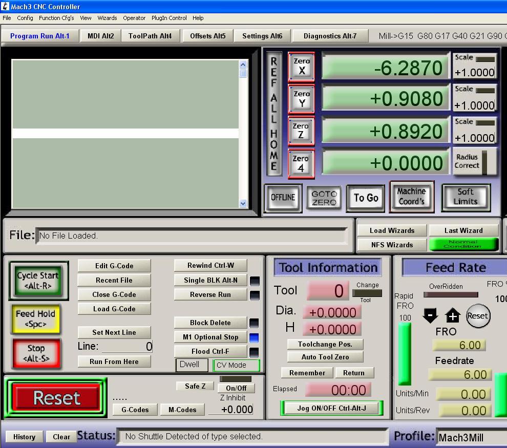 Gracias Collado, no lo conozco tanto al Mach3 y no le di tatas vueltas aún. Estaba con Kcam que me funcionó de una. Adjunto una imagen de pantalla que no es normal. En el Status me dice "No shuttle detected of type selected" :shock: ni idea que significa. Y los botones de los ejes están en rojo. Eso de los botones lo pude poner en verde en la pestaña "diagnostics alt-7" y haciendo click en reset y luego en los botones de ref x, y ref z.