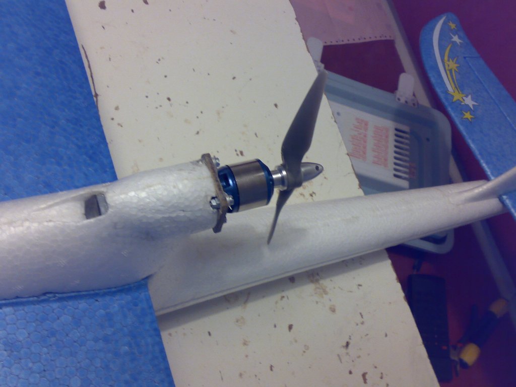 Al motor le he puesto una helice APC 6,5*5,5 que me entra perfectamente sin necesidad de recortar ni la helice ni el fuselaje y tira muy bien de el.